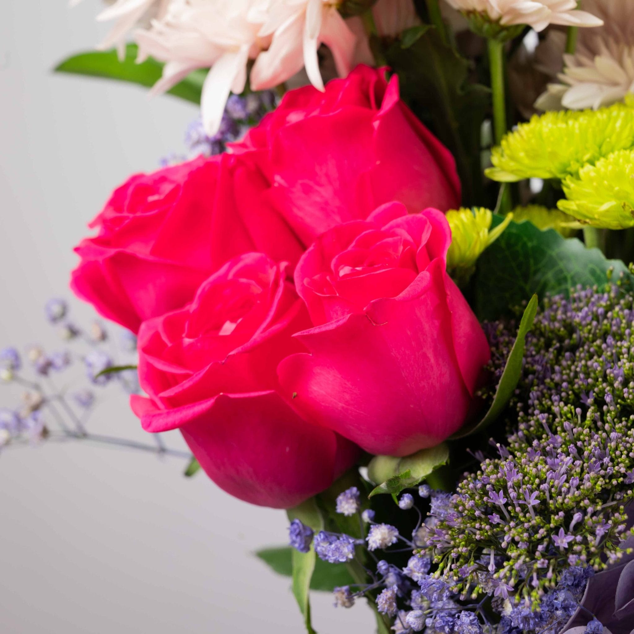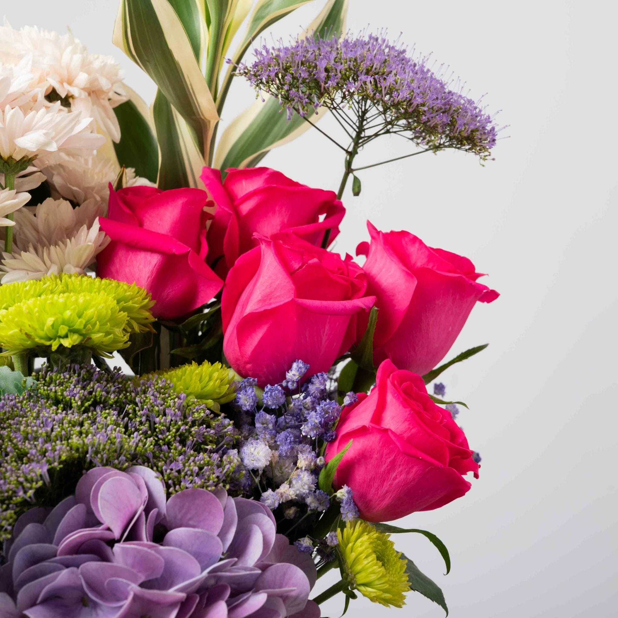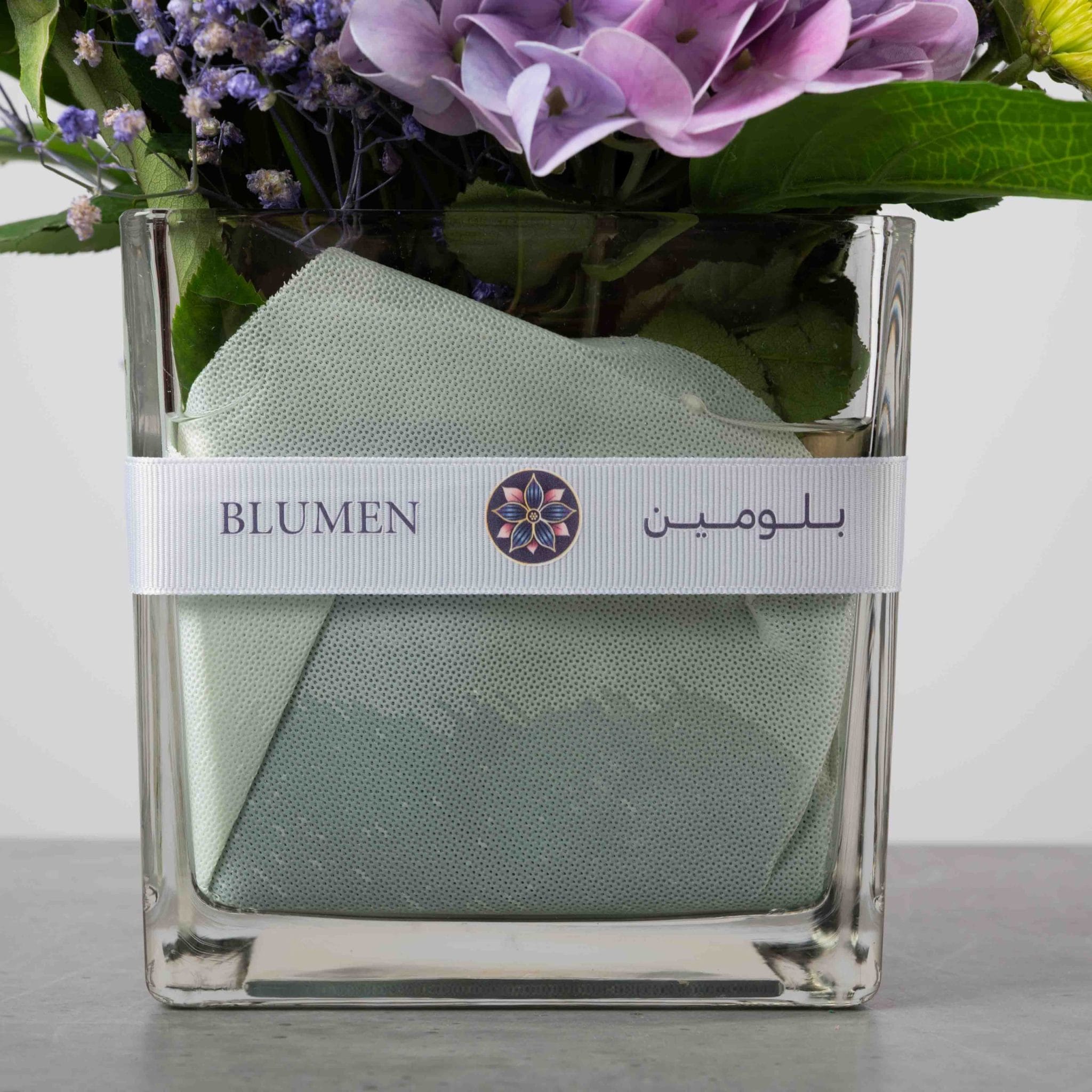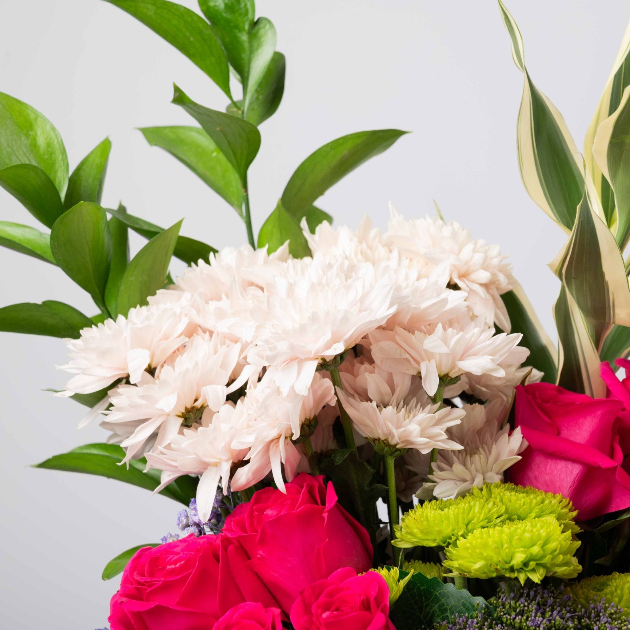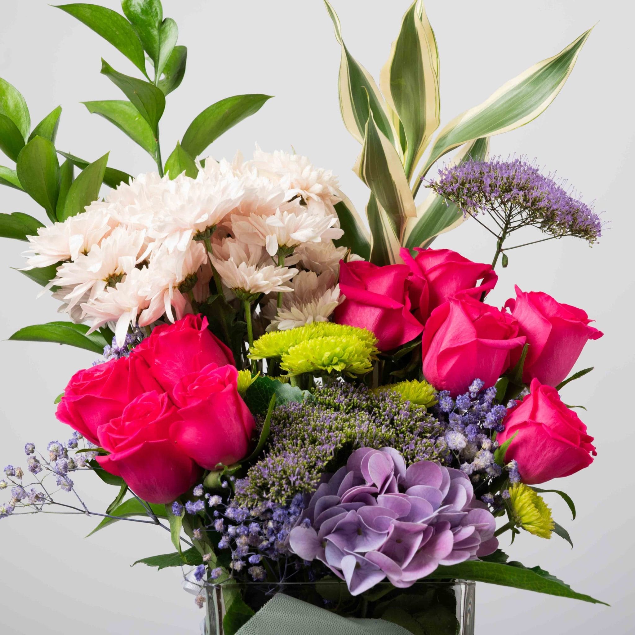 تنسيق مشرق يجمع بين الورود الفوشيا، والأقحوان الأبيض، والكوبية البنفسجية، والأزهار الخضراء الزاهية مع لمسات من الأوراق الخضراء داخل فازة مربعة شفافة من بلومن.