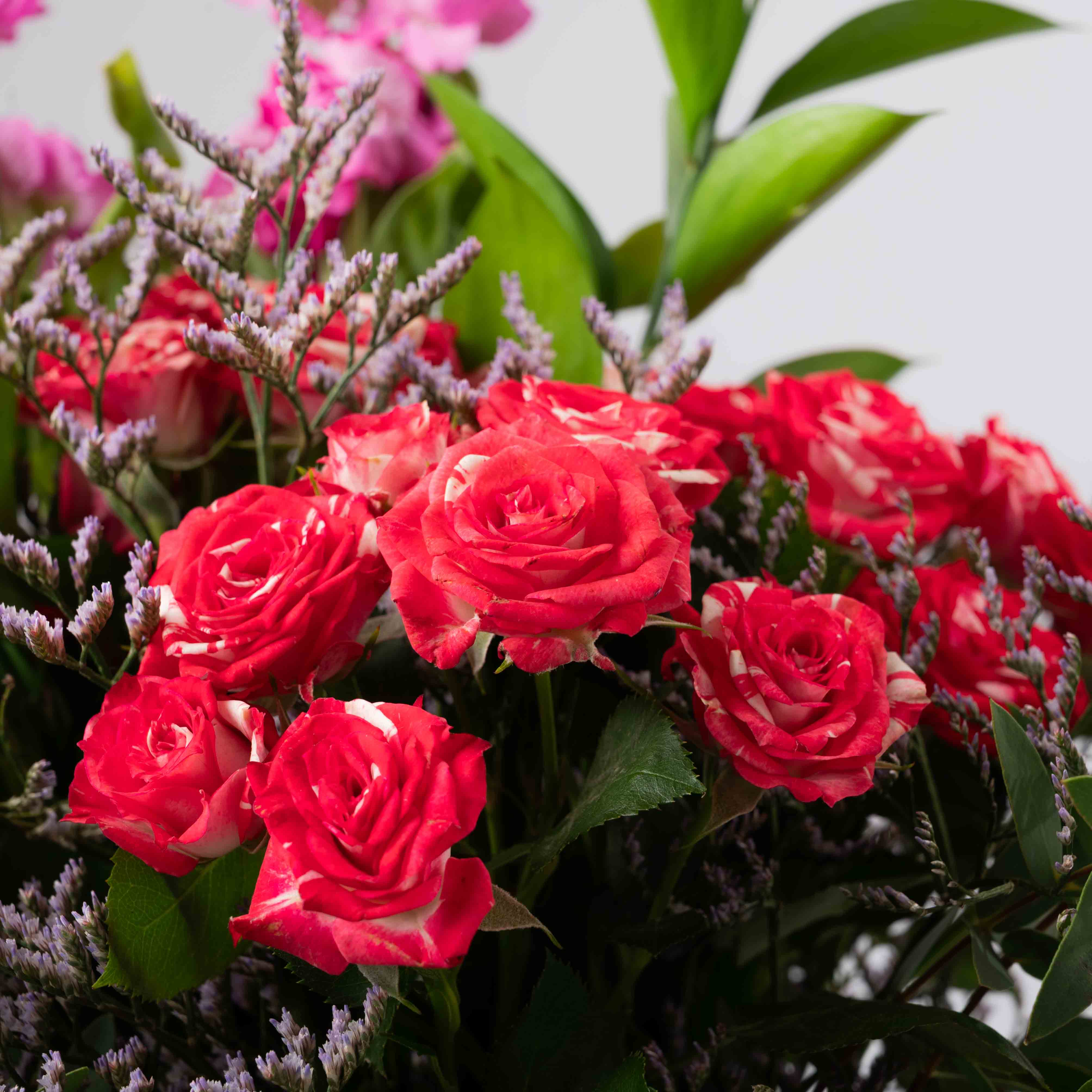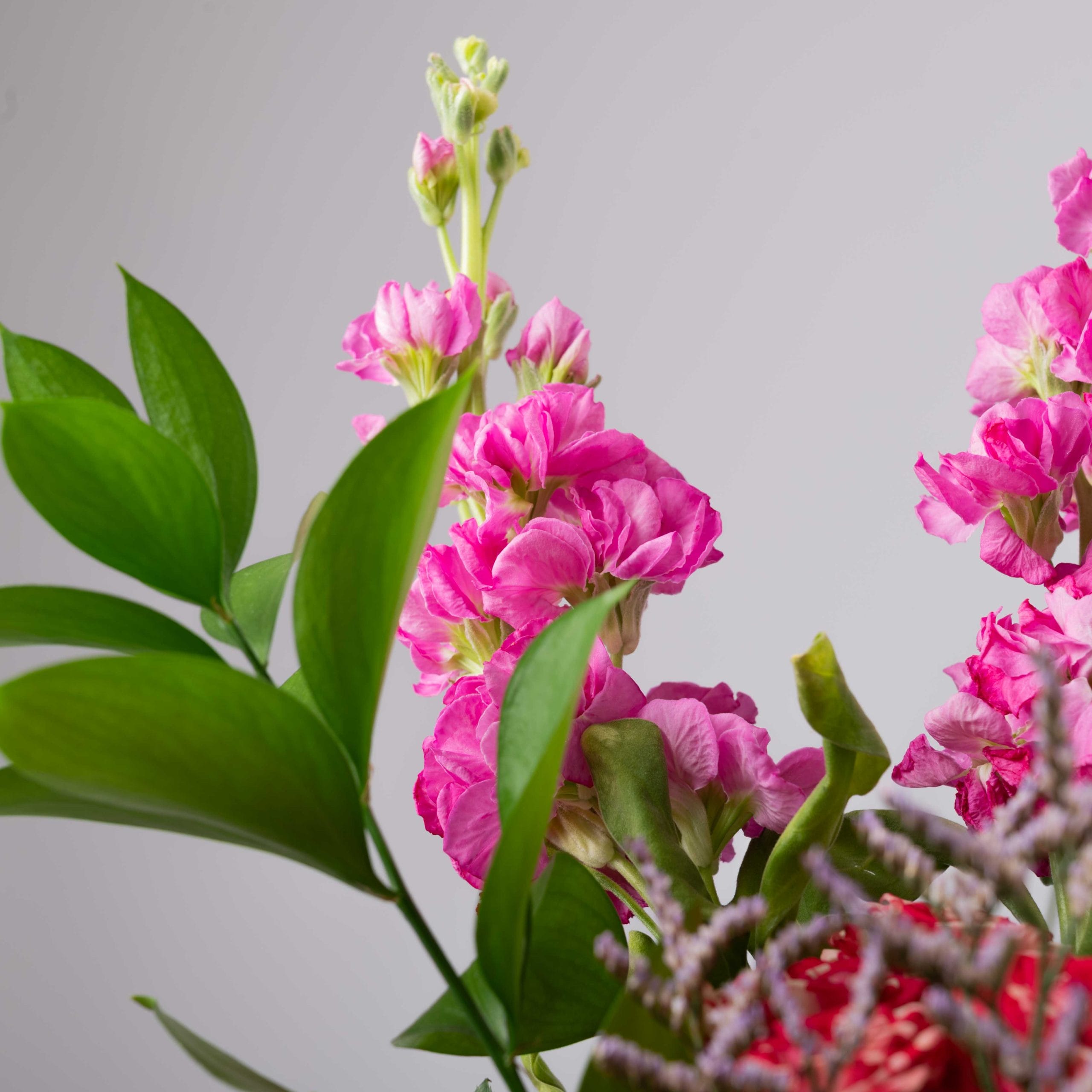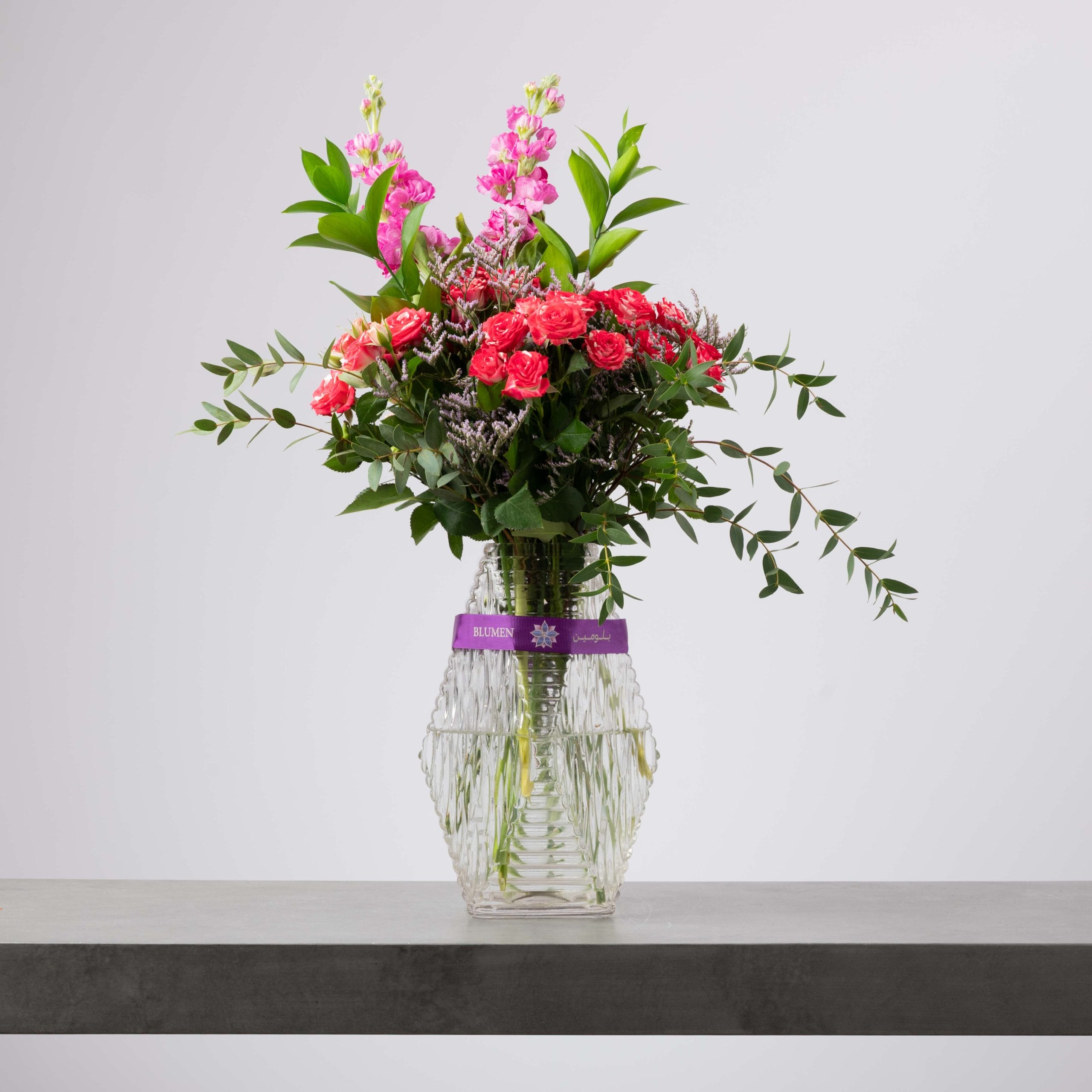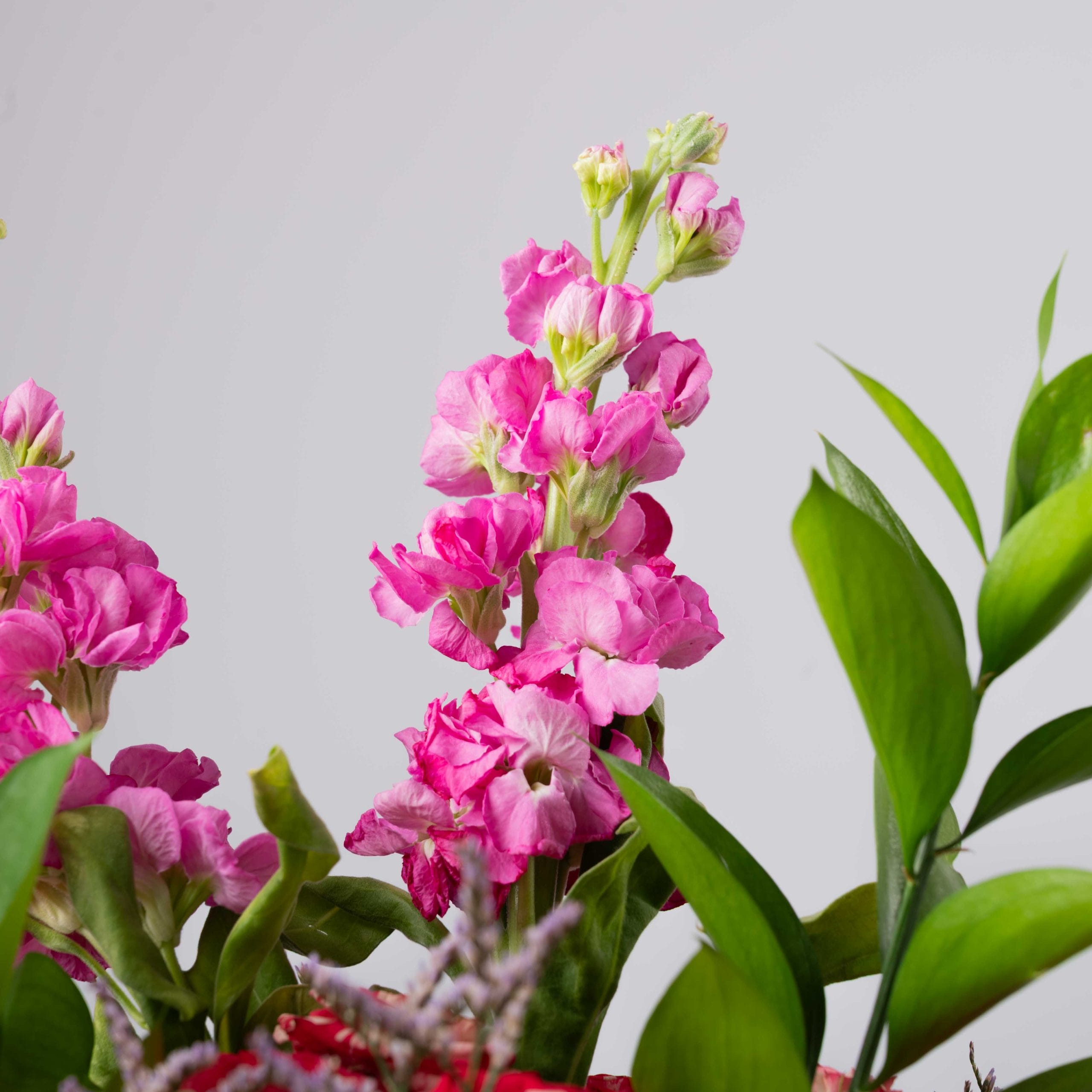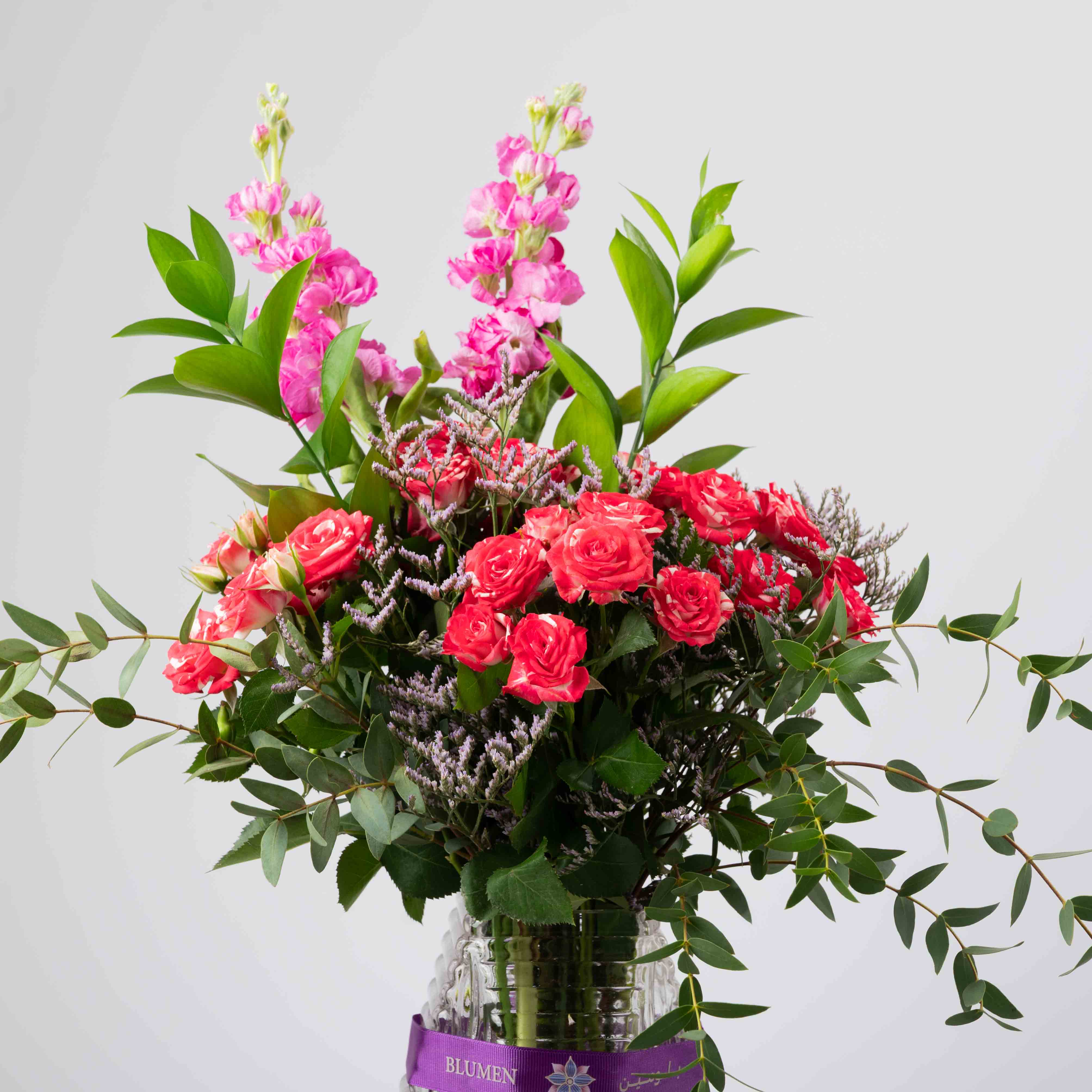 يجسّد فيوشا مورنينغ إحساس الاستيقاظ على سماء ملوّنة بظلال الوردي والأخضر. ترتفع ورود سبراي وردية وزهور فوشيا نابضة بالحياة فوق طبقة من الخضار الطبيعي، جميعها مجتمعة في مزهرية زجاجية هندسية تعكس الضوء بشكل آسر. بتدرجاتها المبهجة وارتفاعها الحيوي وحركتها الانسيابية، يعد فيوشا مورنينغ اختياراً مثالياً لأعياد الميلاد، والتهنئة، وتزيين المكاتب، وكل لحظة تحتاج إلى دفعة فورية من البهجة.
