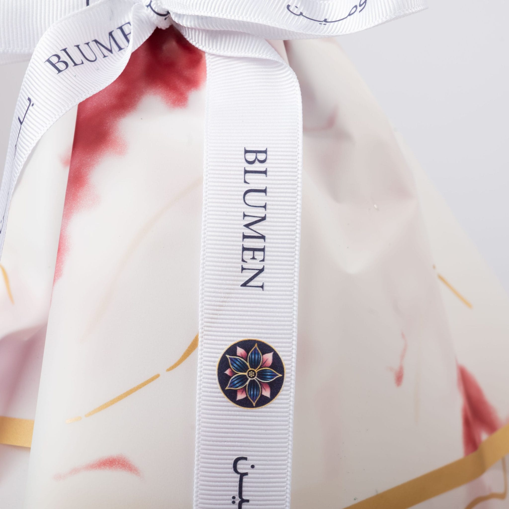 ملفوفة بورق فاخر مزيّن بتفاصيل ذهبية ورسومات فنية ناعمة، ومربوطة بشريط بلومن الأبيض الأنيق الذي يوقّع اللمسة الأخيرة بروح العلامة.