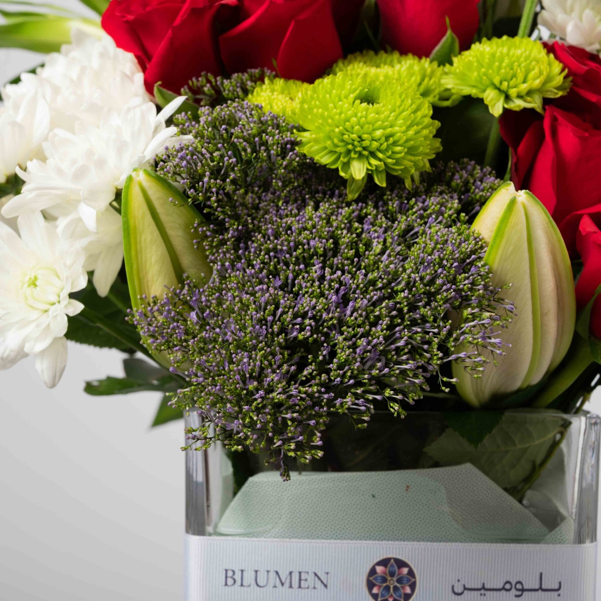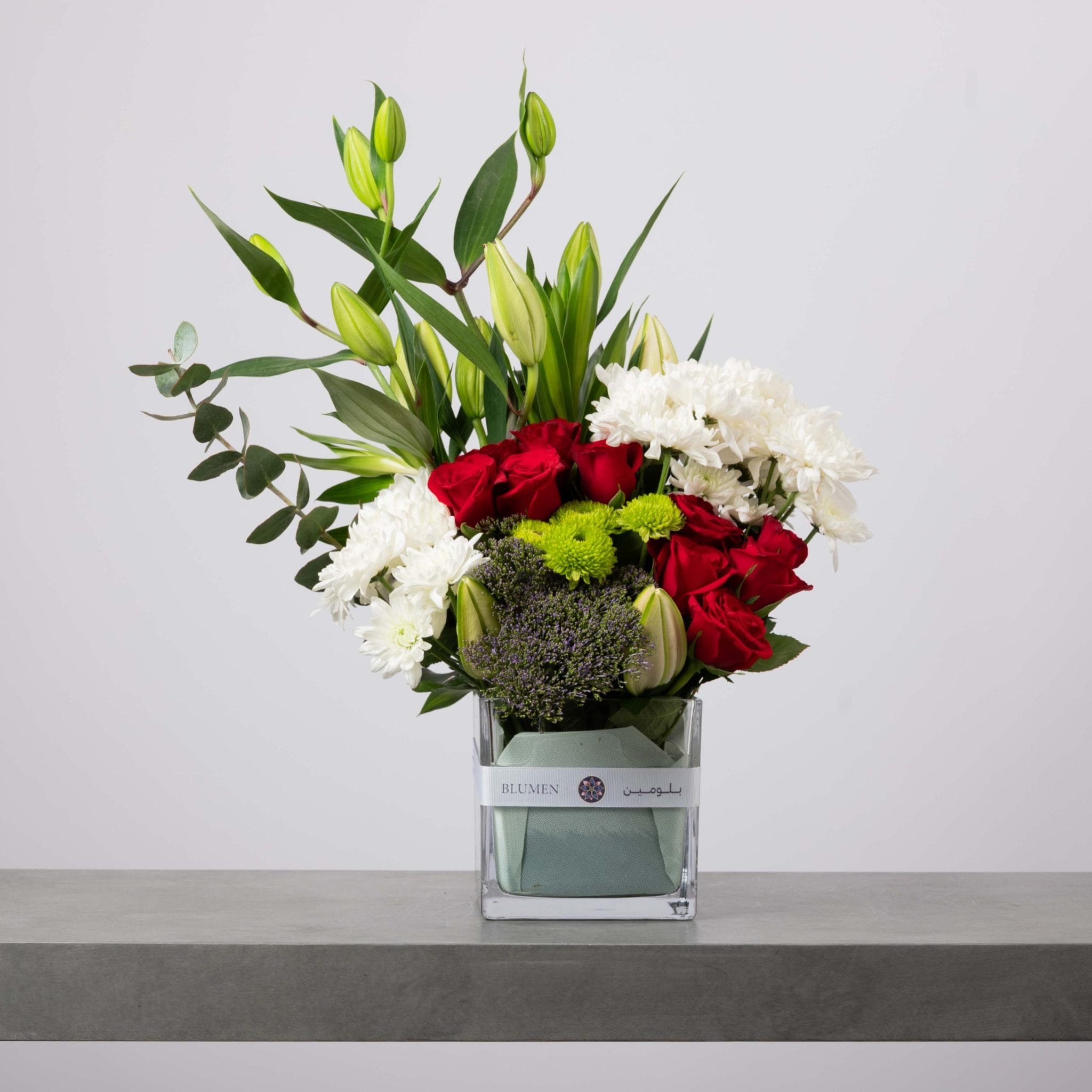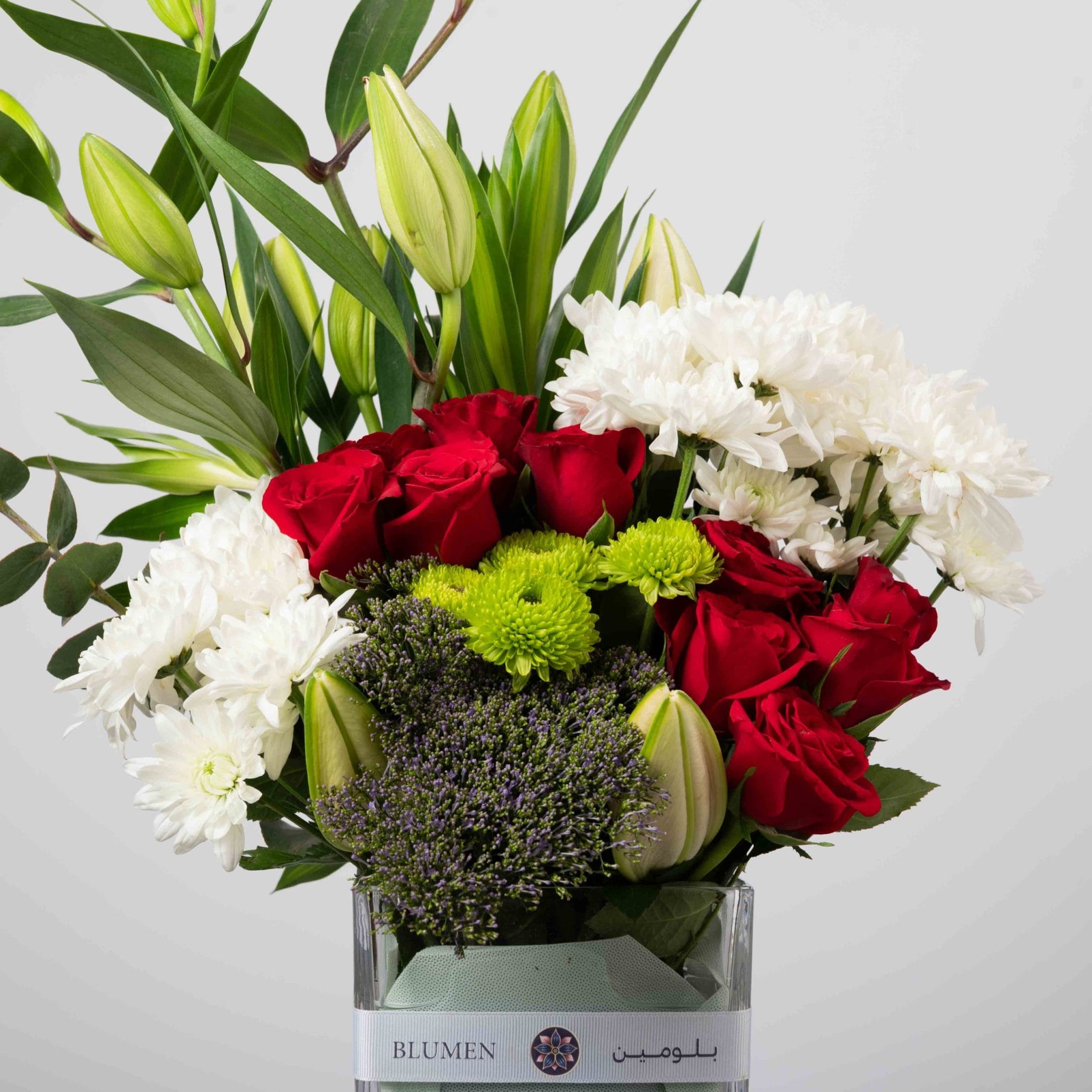تنسيق جريء وأنيق يجمع بين الورود الحمراء الداكنة، والأقحوان الأبيض النقي، والأزهار الخضراء، والزنابق المنعشة داخل فازة زجاجية شفافة من بلومن.