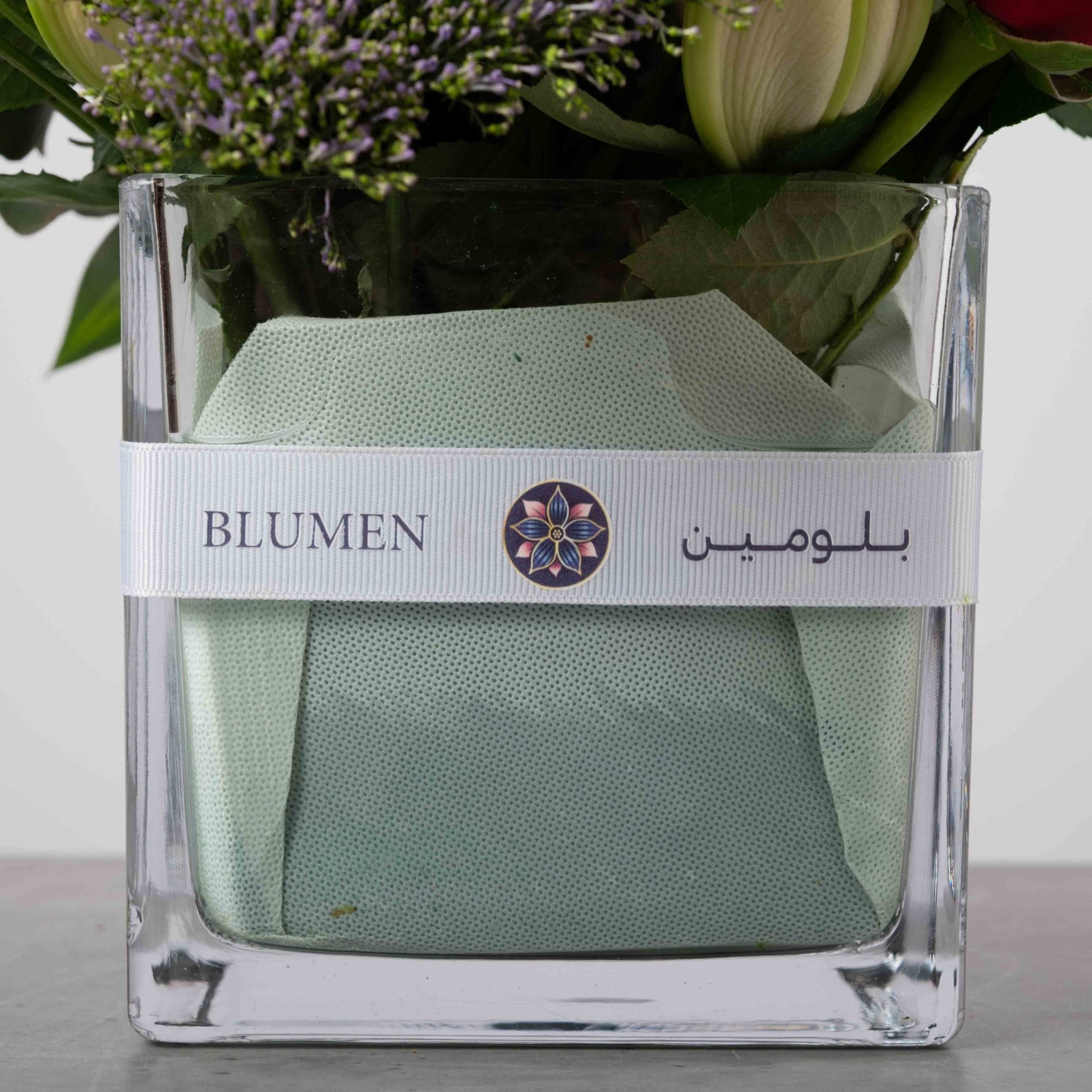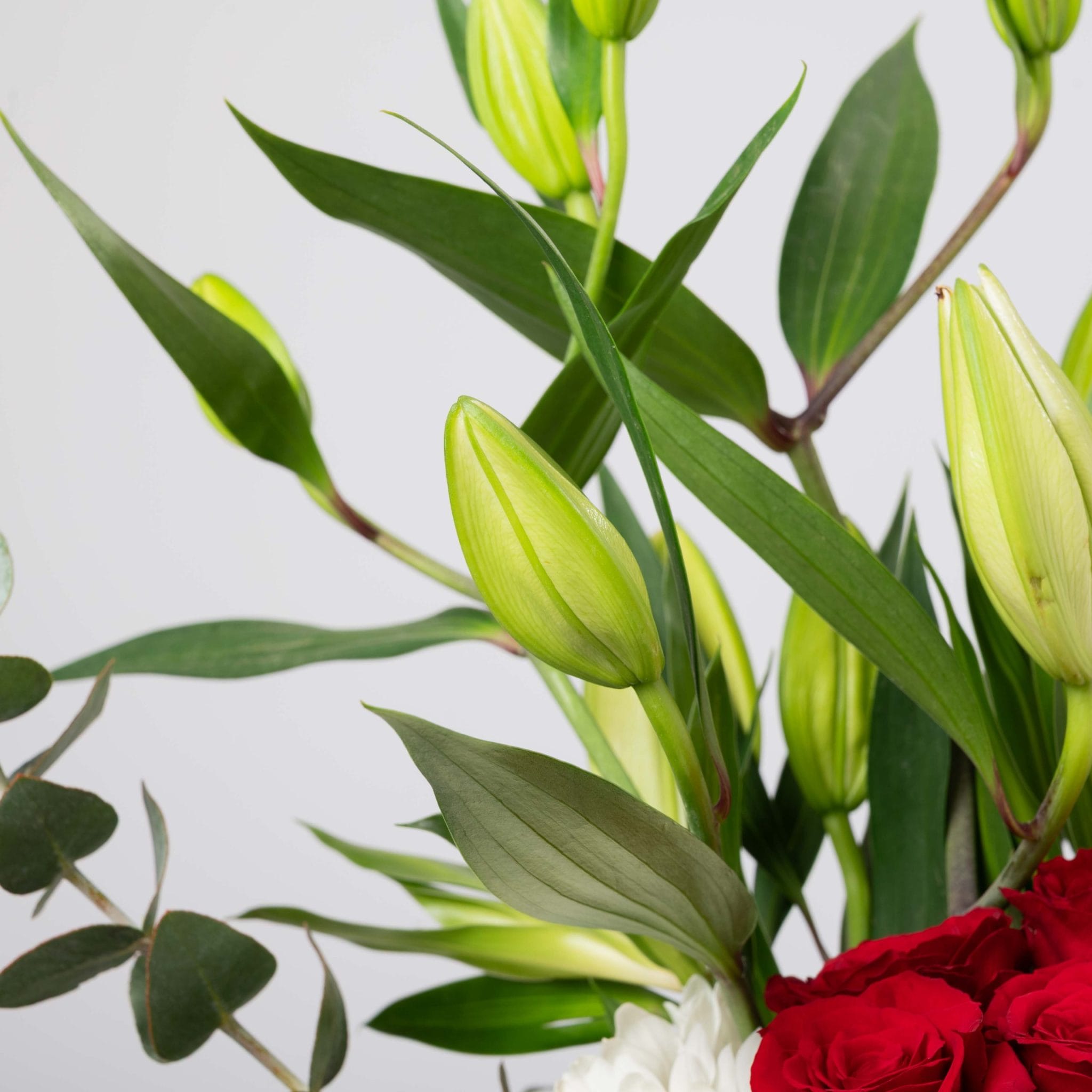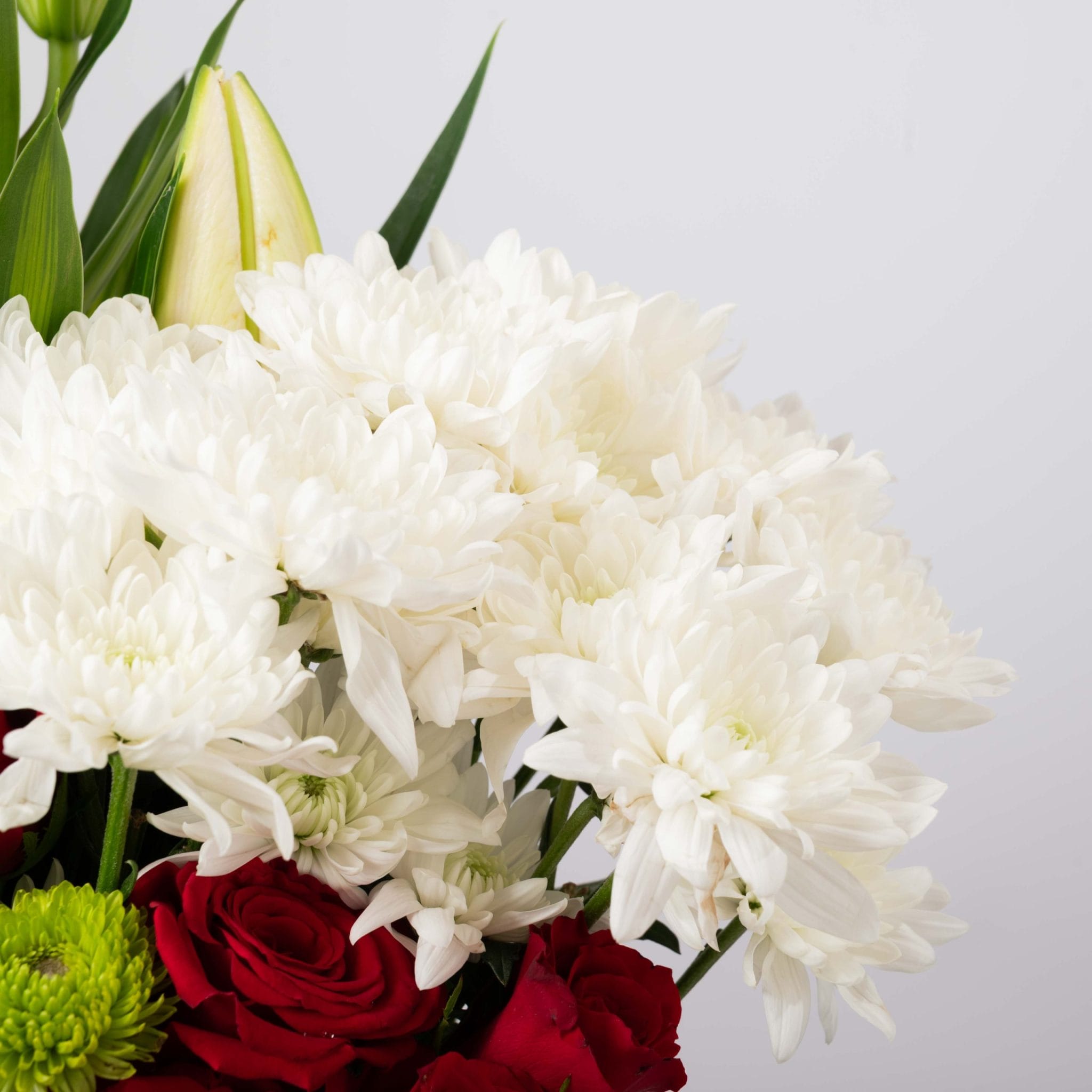 تنسيق جريء وأنيق يجمع بين الورود الحمراء الداكنة، والأقحوان الأبيض النقي، والأزهار الخضراء، والزنابق المنعشة داخل فازة زجاجية شفافة من بلومن.