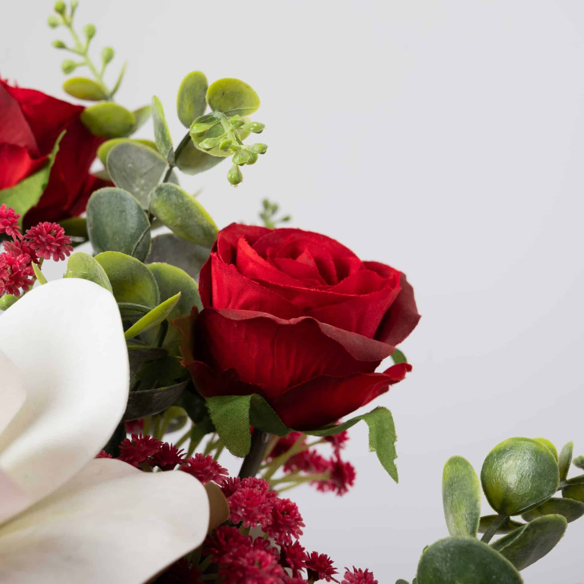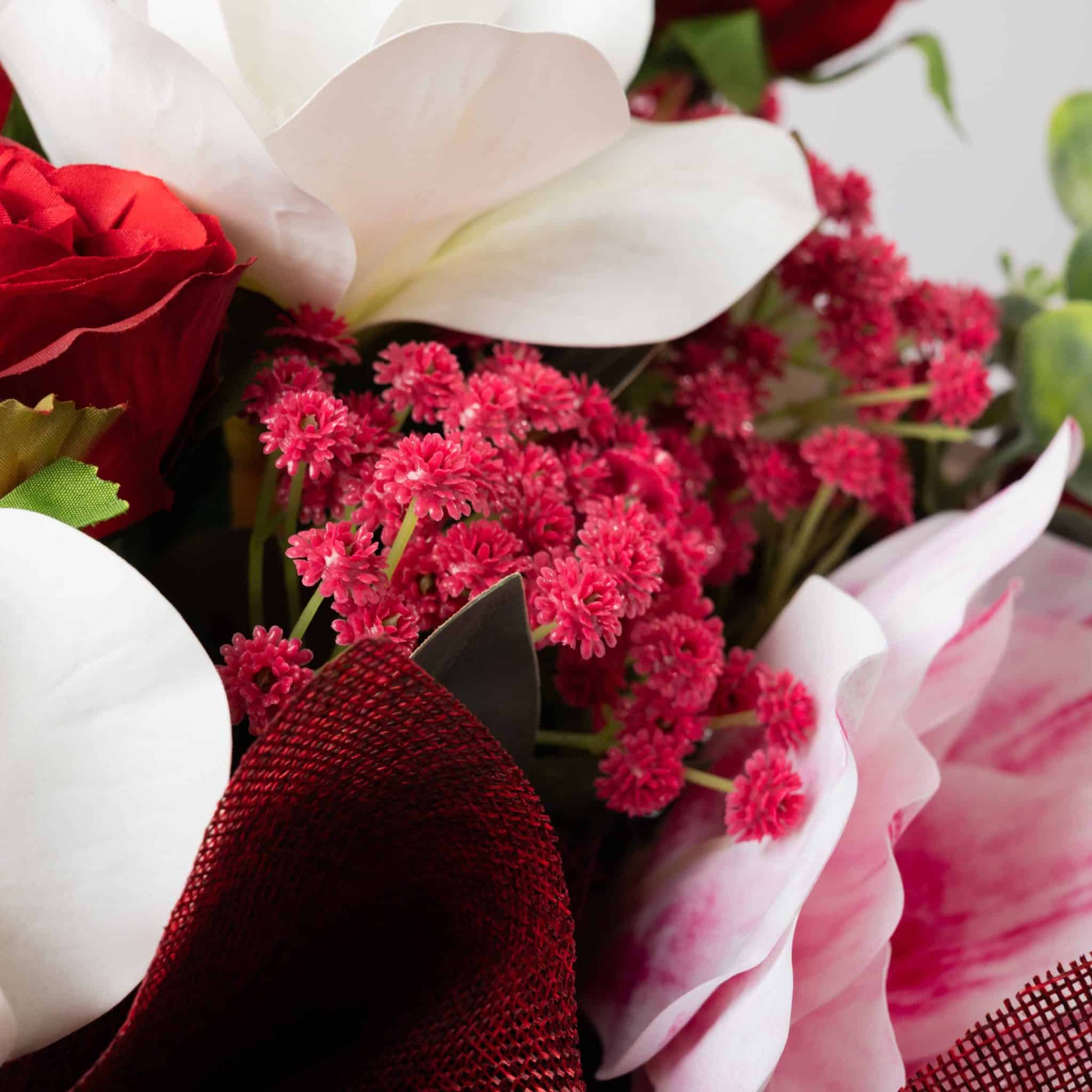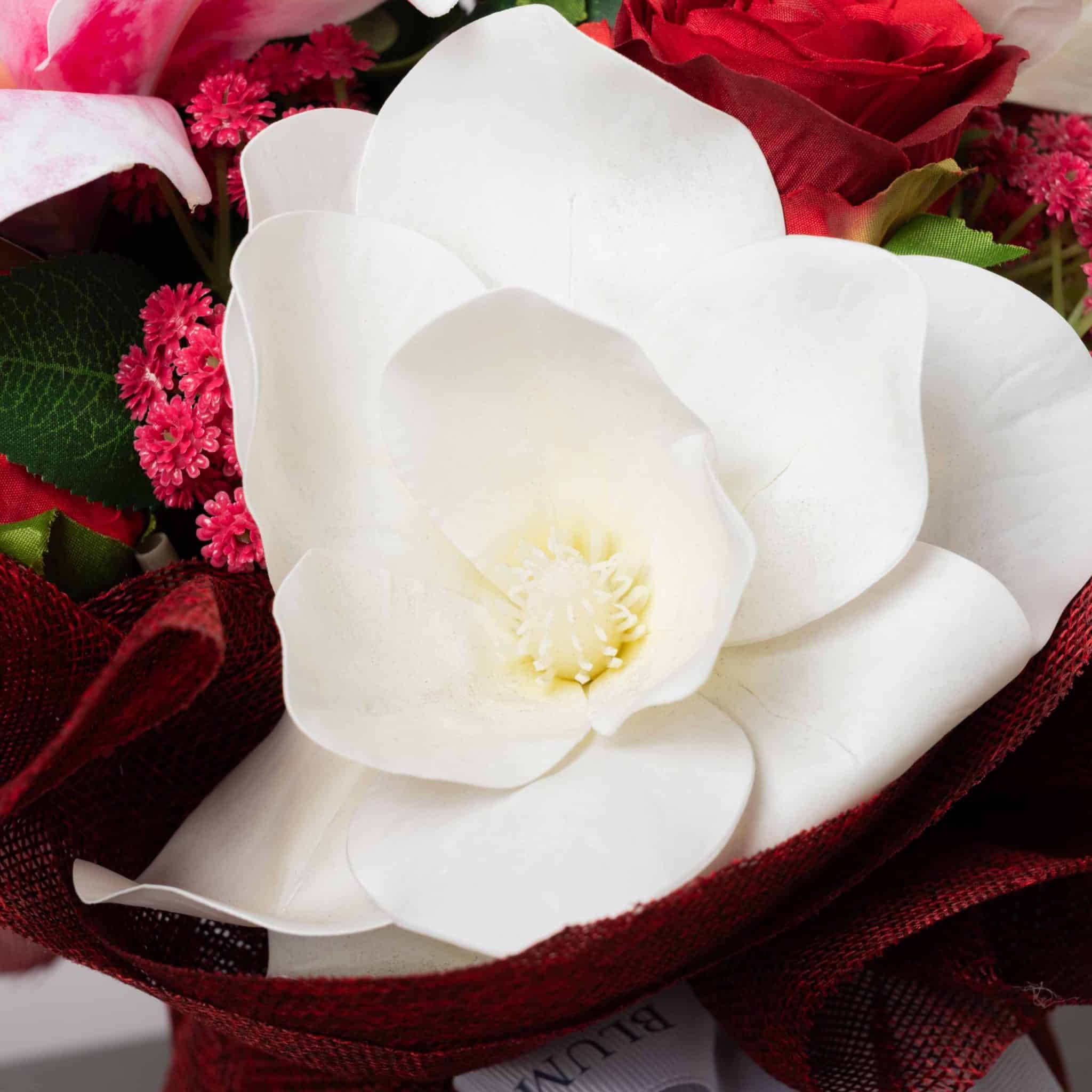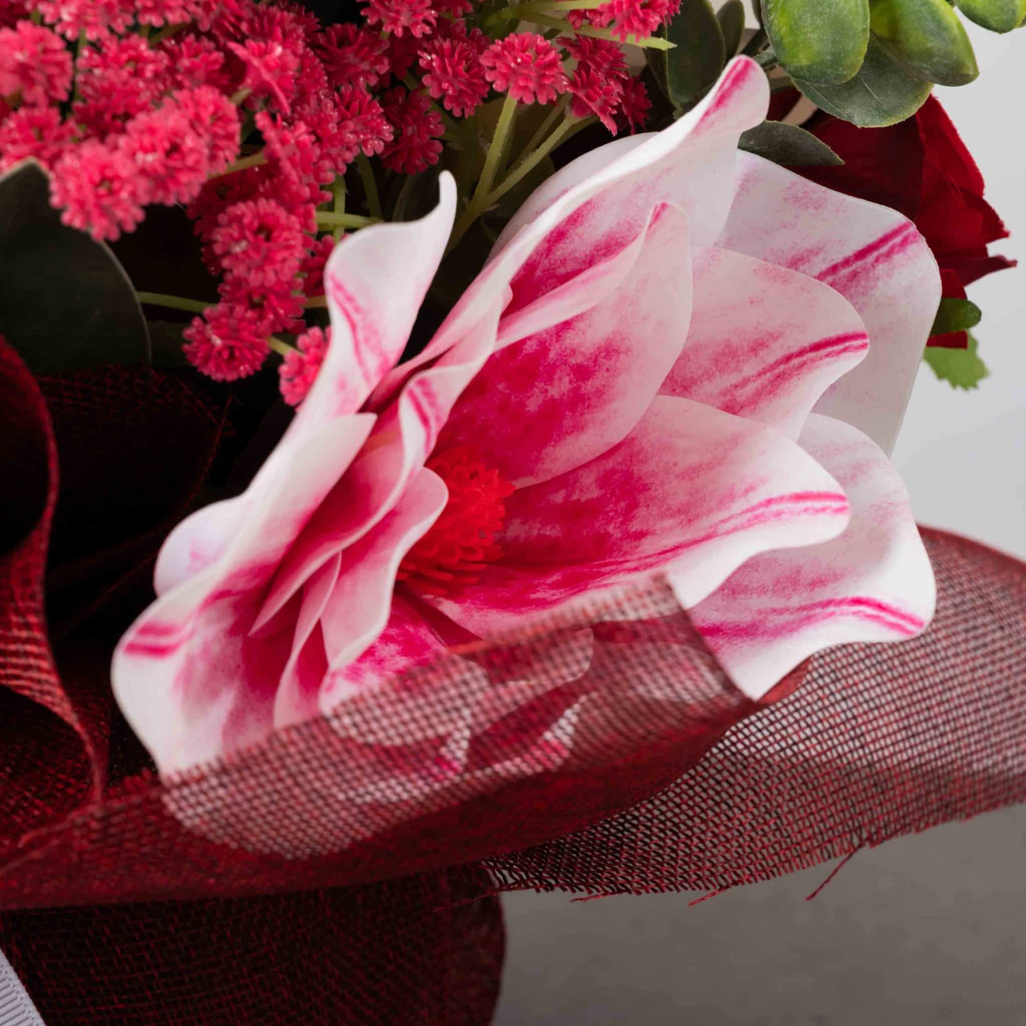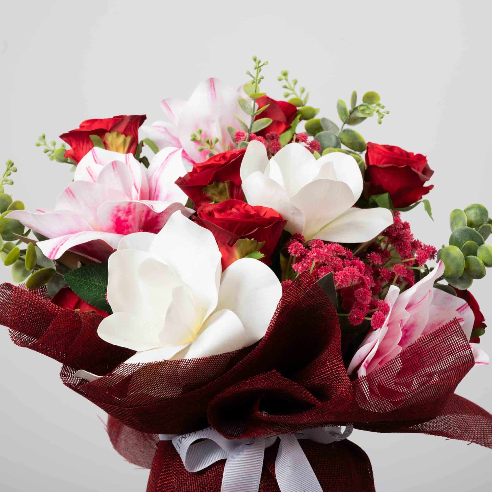 مزيج ساحر من الورود الحمراء والمانيوليا البيضاء والزنابق الوردية يتناغم مع أوراق الأوكالبتوس الطازجة، مغلف بـ قماش خمري فاخر ومزين بـ شريط بلومن الأنيق.