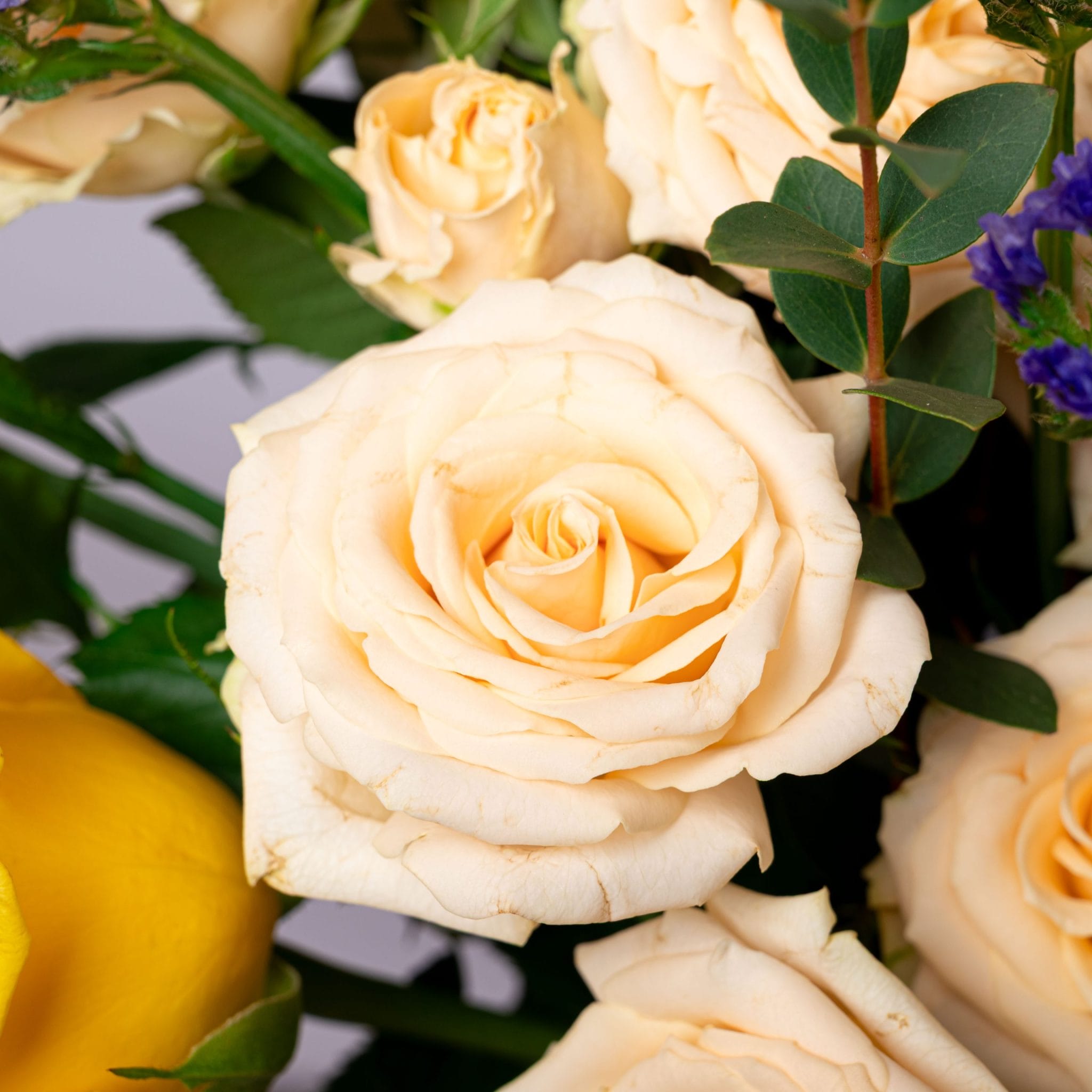 يحتوي على مزيج متناغم من الورود الصفراء الزاهية، الورود الكريمية الناعمة، وأزهار الجلاديولس البيضاء الطويلة التي تضيف طابعاً ملكياً أنيقاً، إلى جانب لمسات من الزهور البنفسجية الصغيرة التي تمنحه عمقاً بصرياً ساحراً.