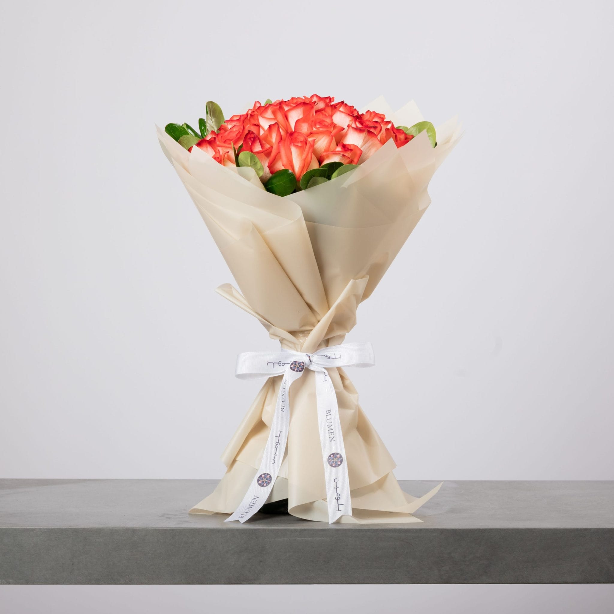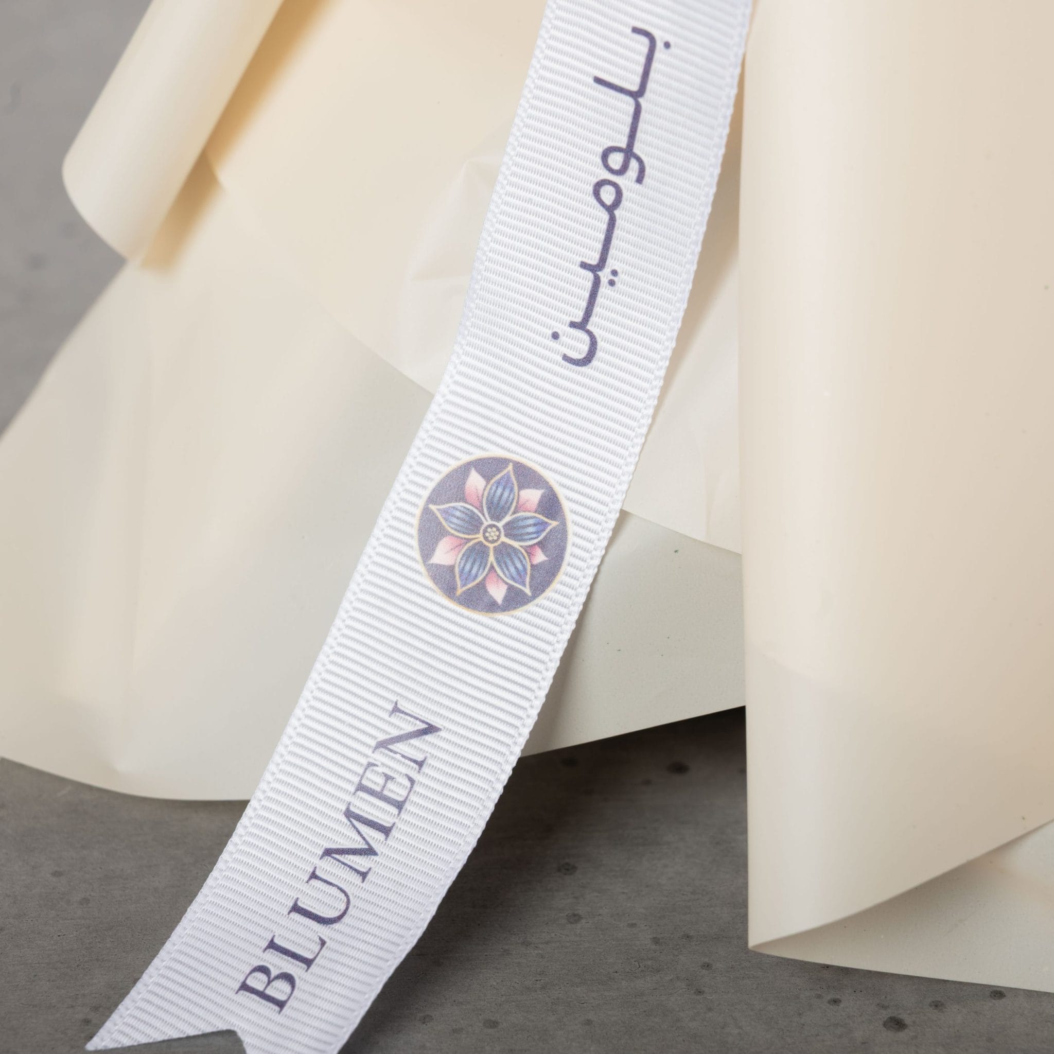 تُربط بشريط بلومن الأبيض الأنيق الذي يوقّع التصميم بخطّه المميّز ويكمّل مشهد التناسق الراقي.