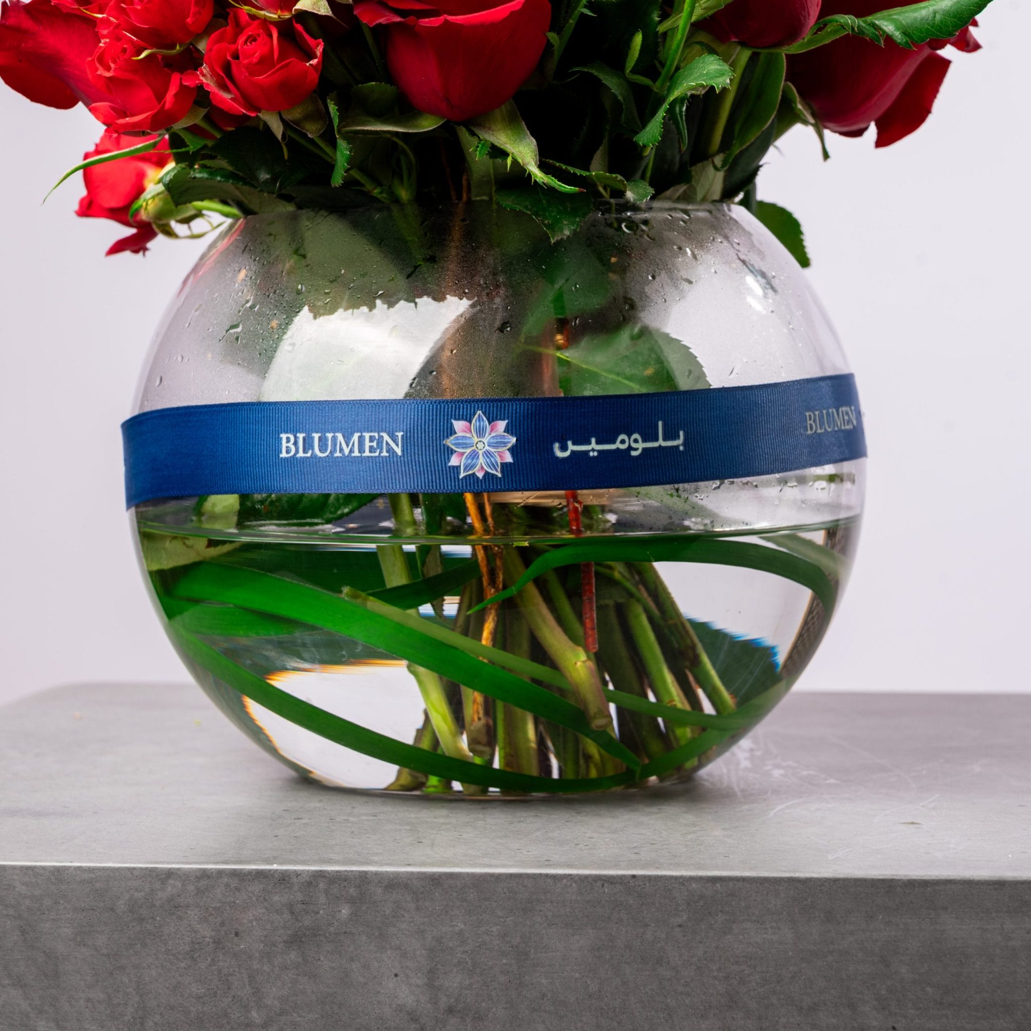 تُزيَّن المزهرية بشريط BLUMEN | بلومن الأزرق الأنيق، لتكتمل لوحة الفخامة والرومانسية في تصميم واحد.