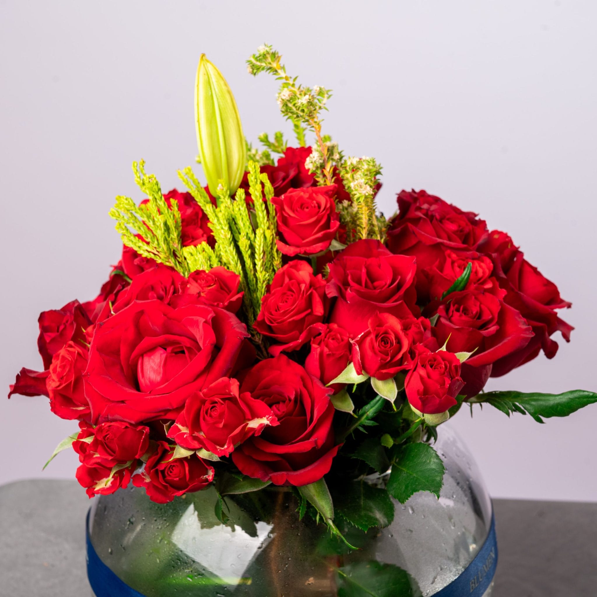 تنسيق ساحر من بلومن يجمع بين الورود الحمراء الكلاسيكية وعناصر خضراء طبيعية تمنحها توازناً بصرياً مدهشاً.