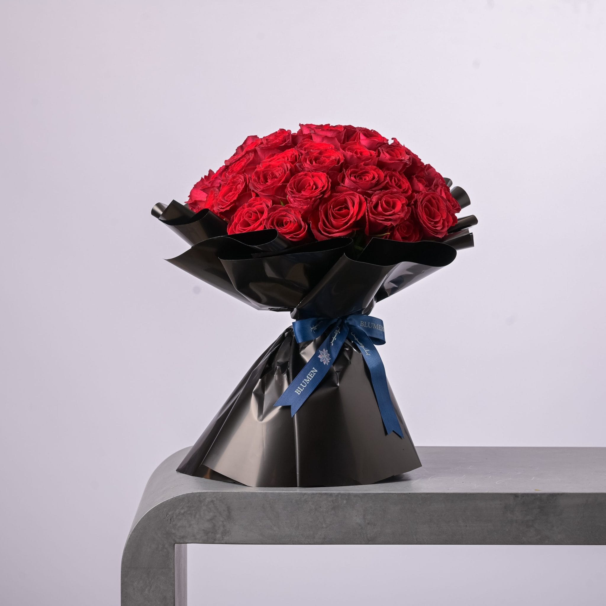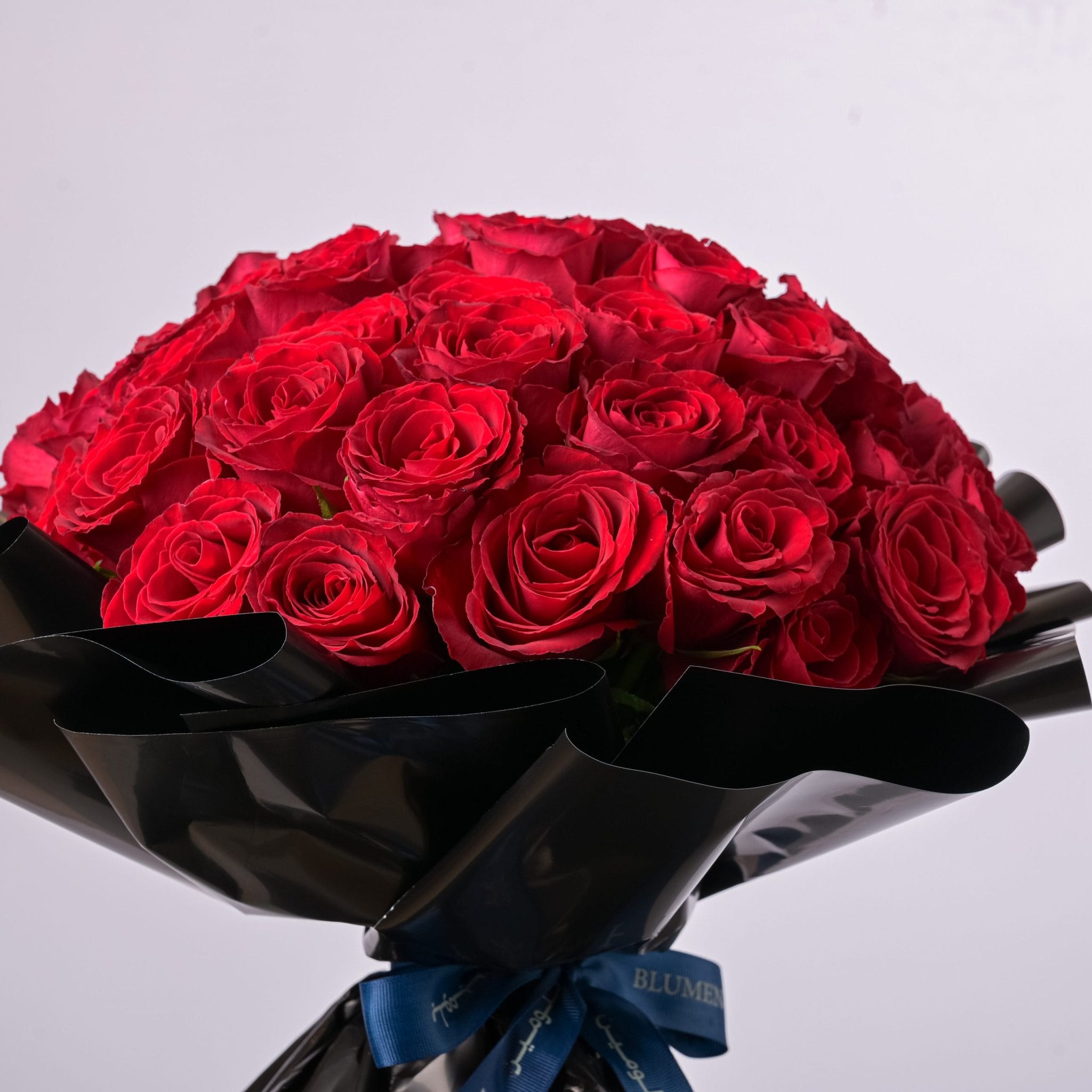 تصميم يوازن بين القوة والرومانسية من بلومن — باقة فاخرة من الورود الحمراء العميقة مغلّفة بورق أسود لامع يعكس فخامة استثنائية وجرأة راقية.