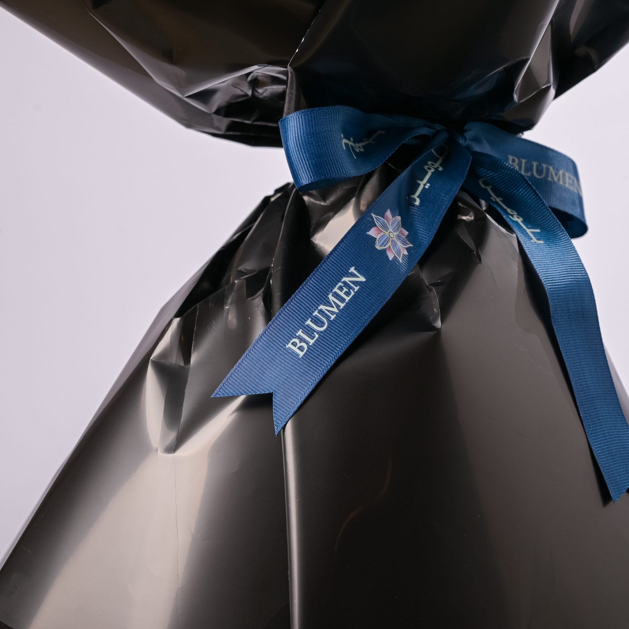 تُربط الباقة بشريط BLUMEN | بلومن الأزرق الملكي، ليضيف لمسة من التميز والترف.