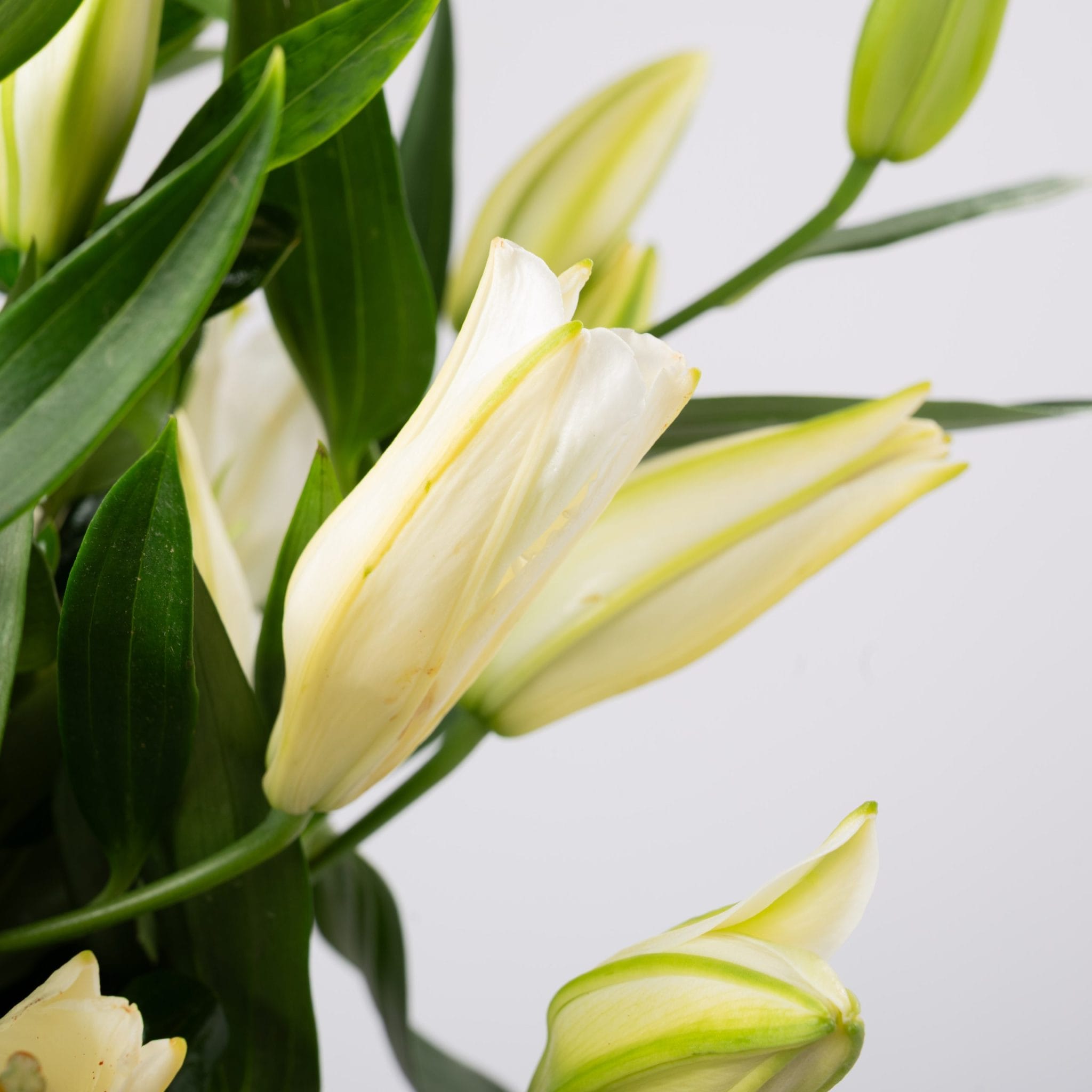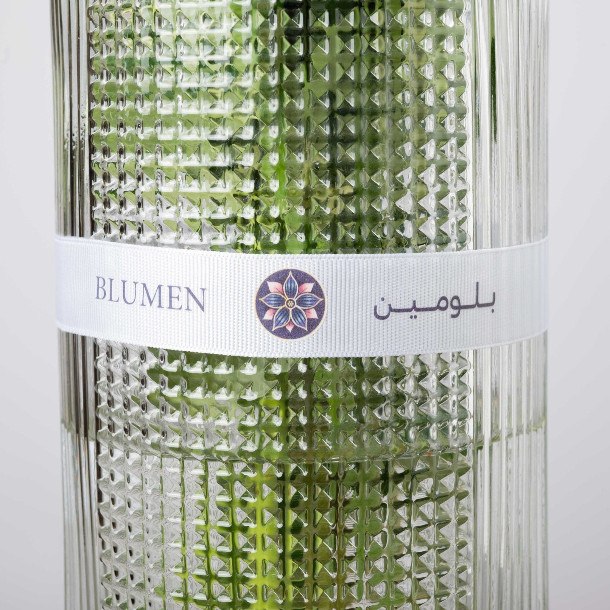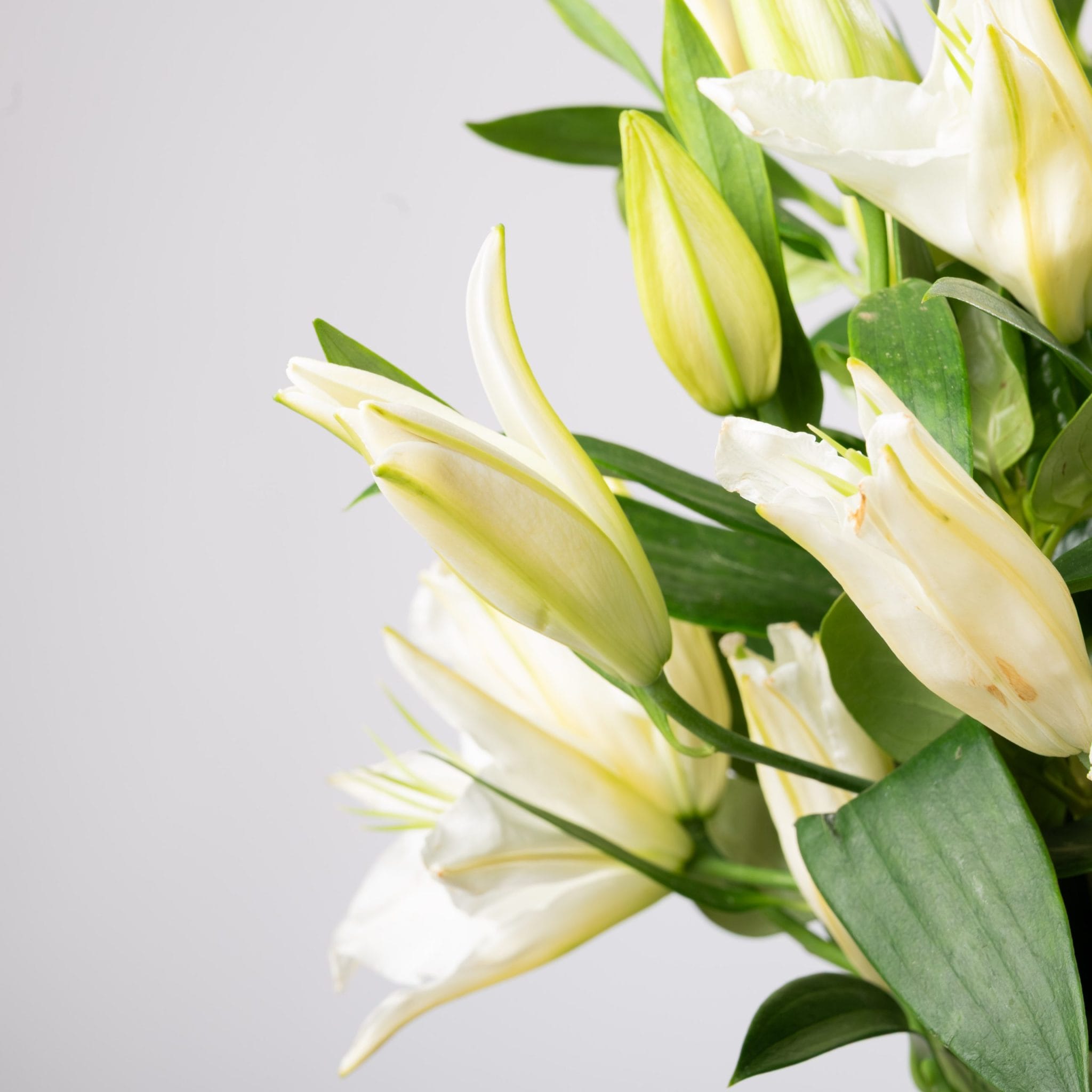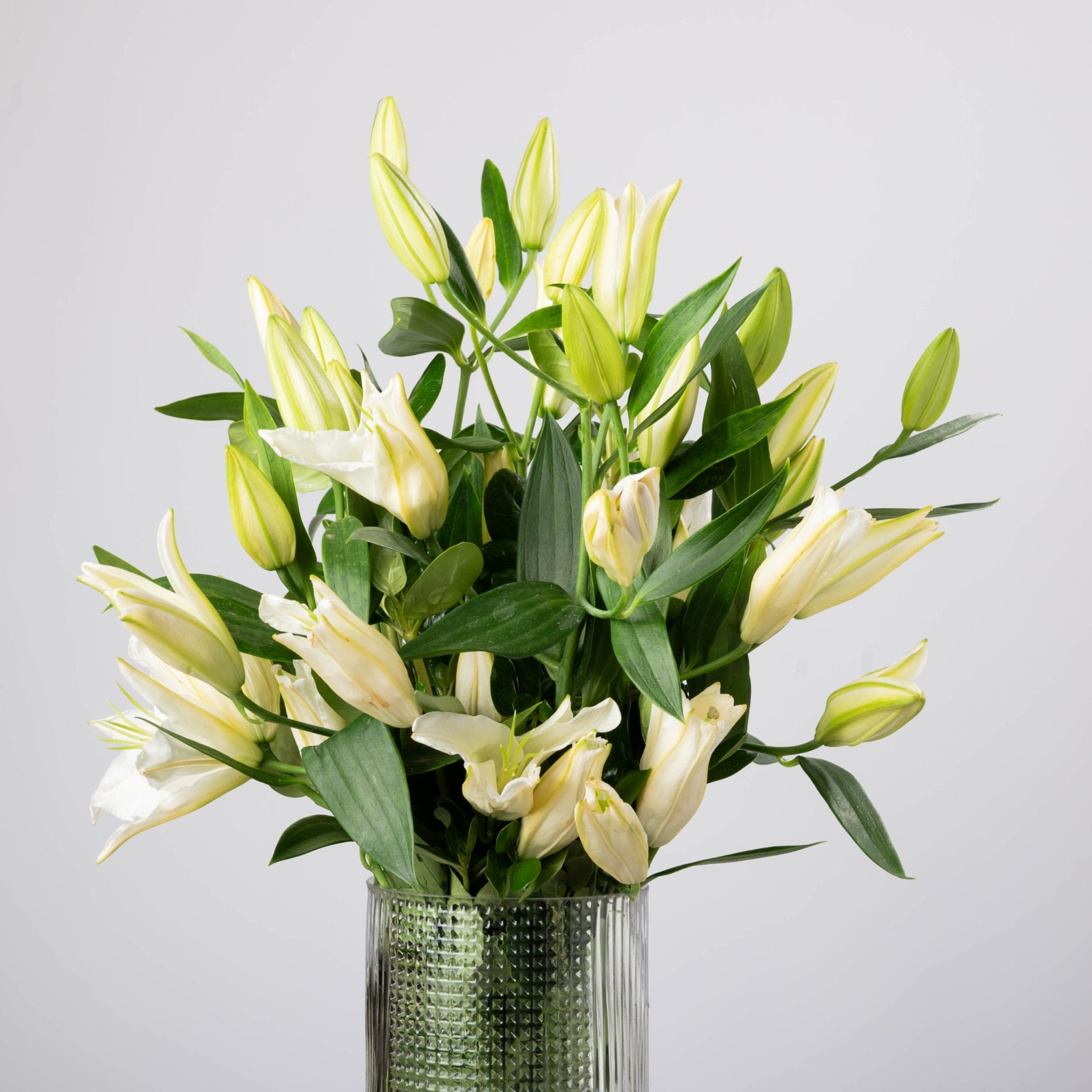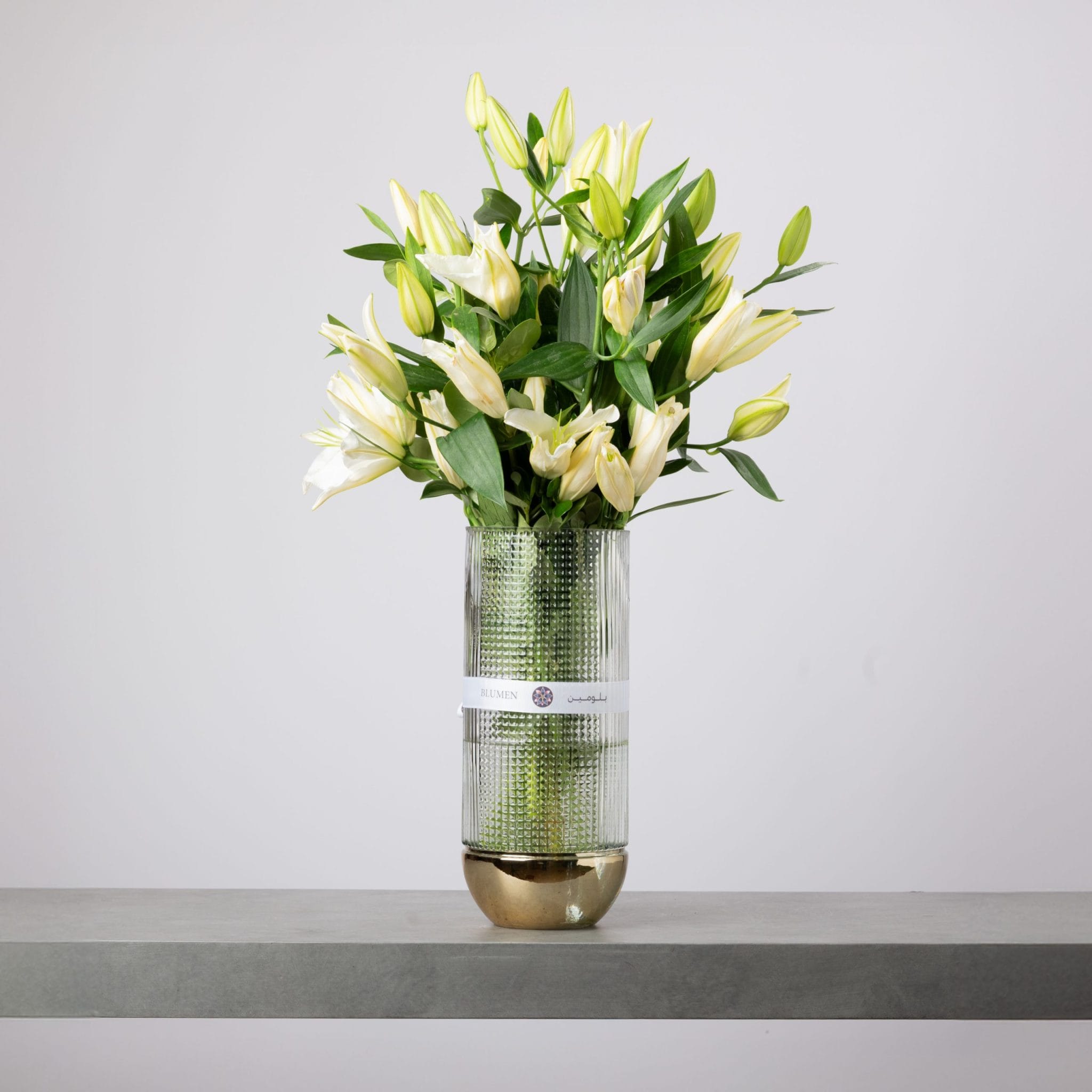 تنسيق فاخر من زهور الزنبق البيضاء الطبيعية داخل فازة زجاجية شفافة بتفاصيل ذهبية أنيقة، مقدّم من بلومن بأسلوب يجسّد التوازن بين البساطة والفخامة.