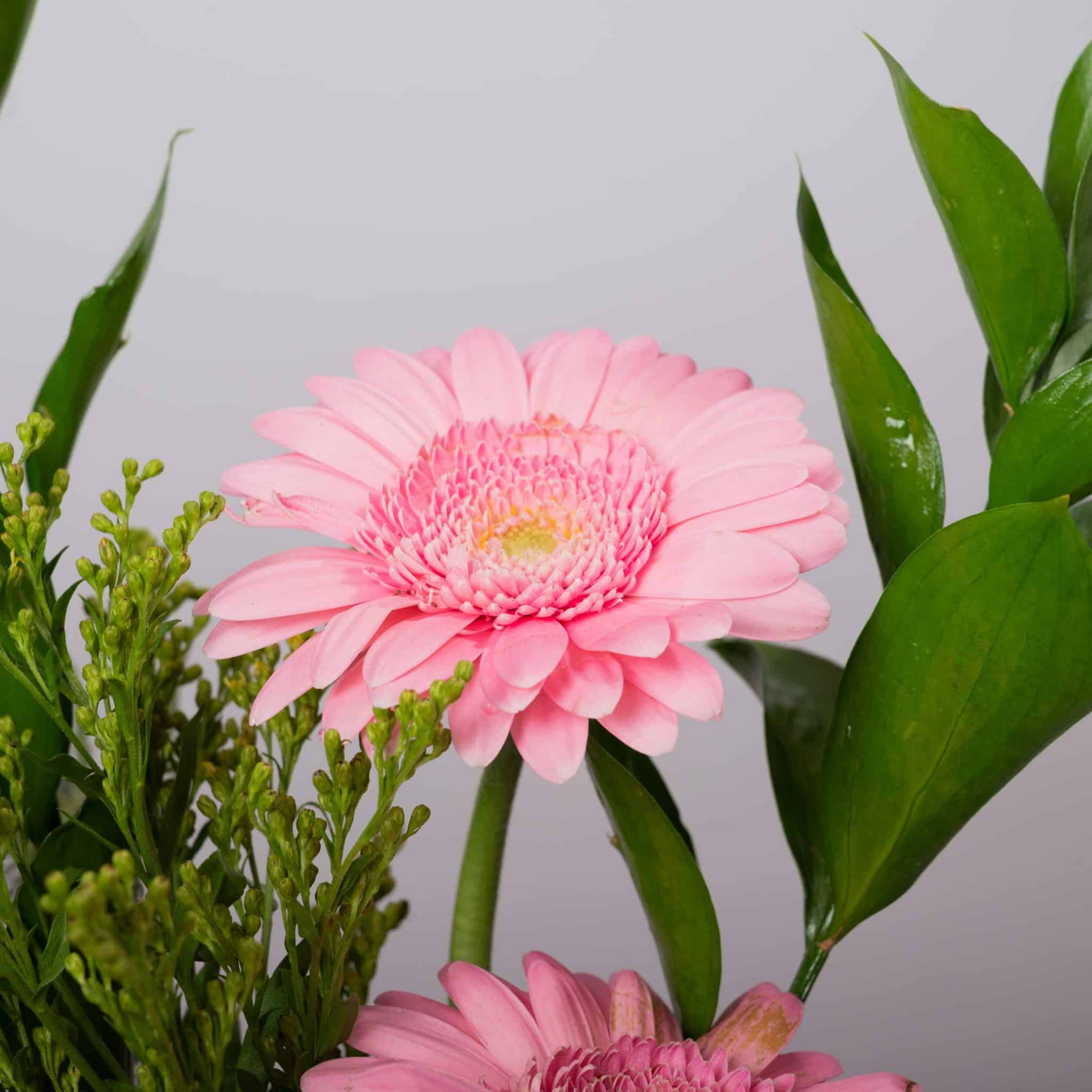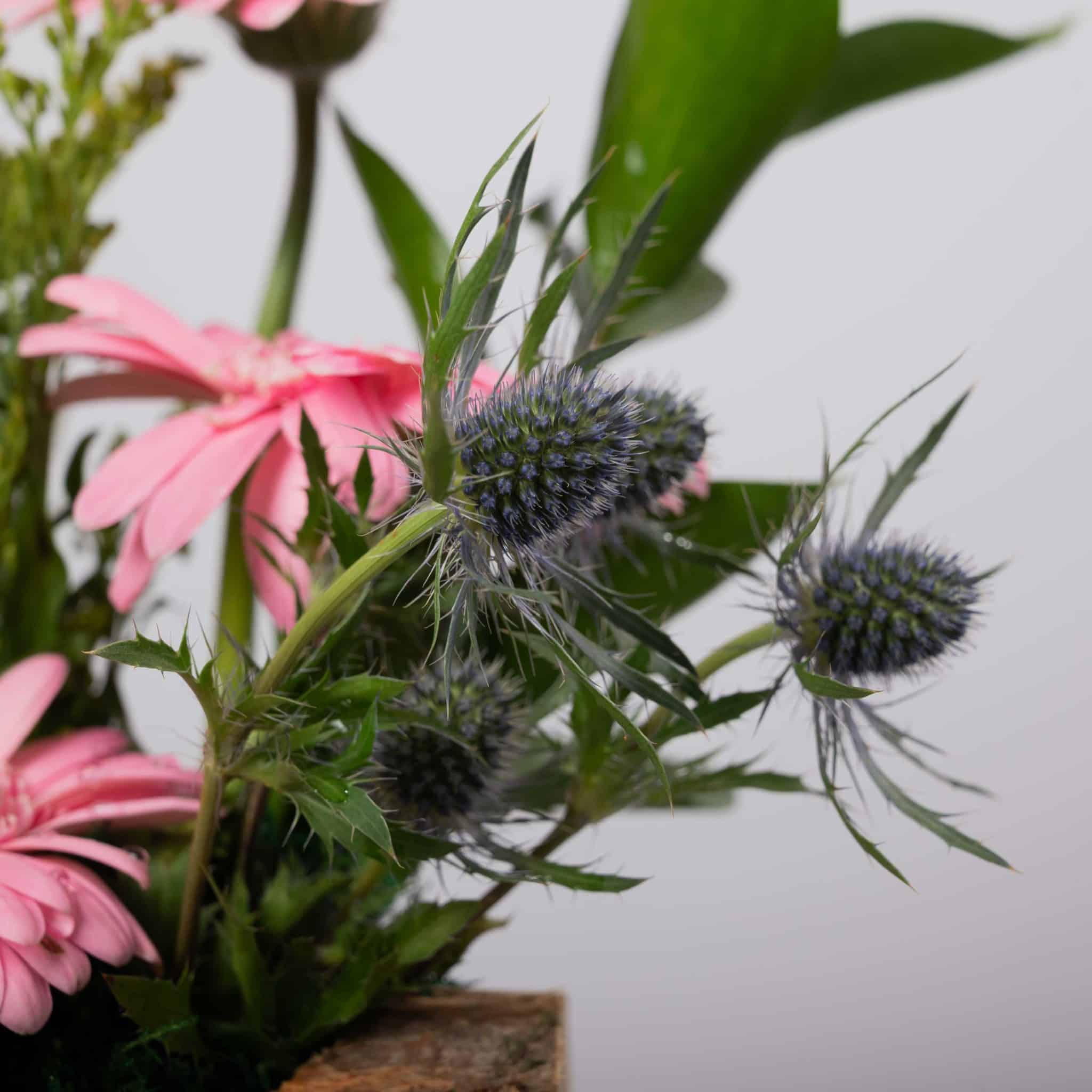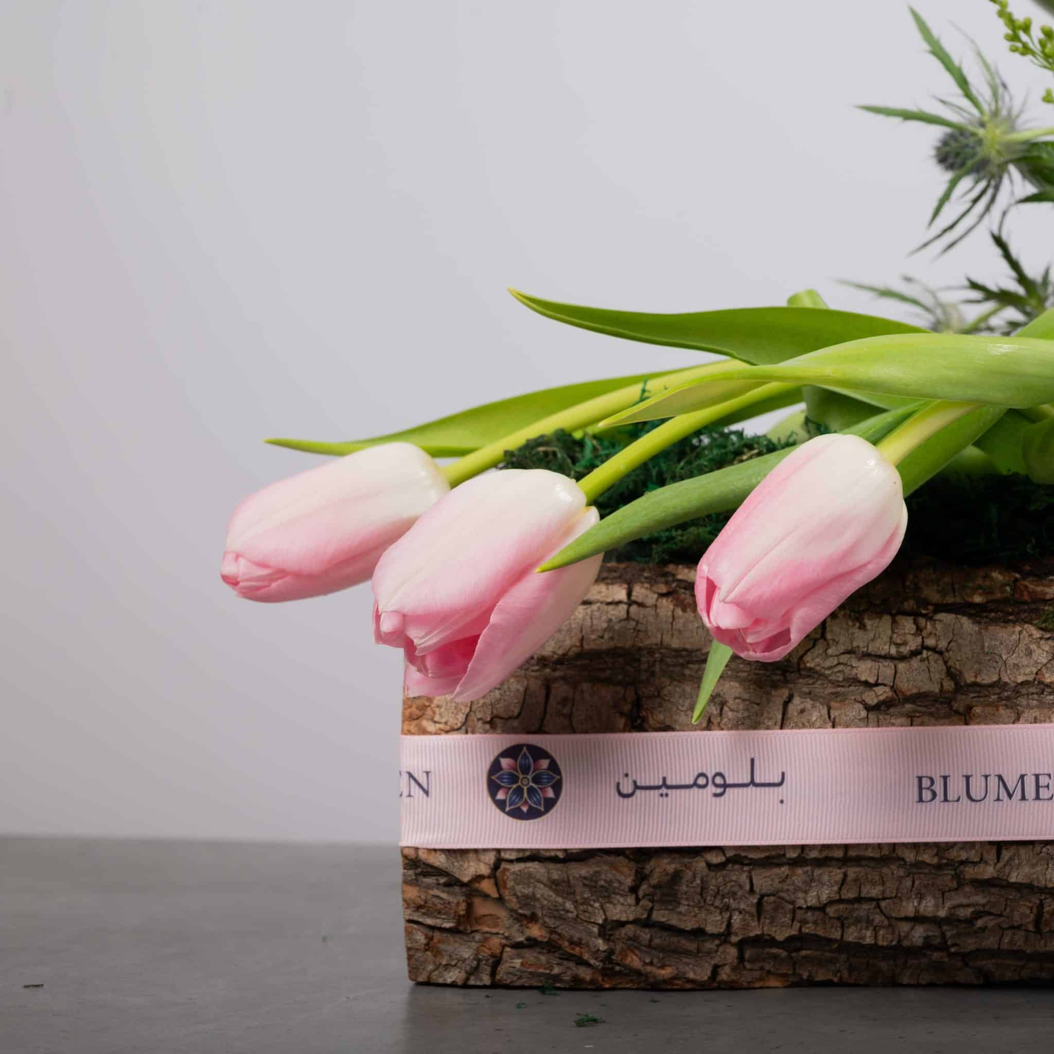 يأخذك وودلاند بلش إلى سحر فسحة هادئة في قلب الغابة. تتدلّى أزهار التوليب الوردية برقة على مزهرية ريفية مكسوّة بقشرة الشجر، وتحيط بها جربيرا وردية وخضار طبيعي ولمسات من زهور الشوك الزرقاء لتمنح إحساساً طبيعياً وكأنها من قصة خيالية. يكتمل التنسيق بشريط وردي ناعم من بلومن، ليكون مثالياً للمنازل الدافئة، واللقاءات الحميمة، أو كهدية مميزة لعشاق الطبيعة.