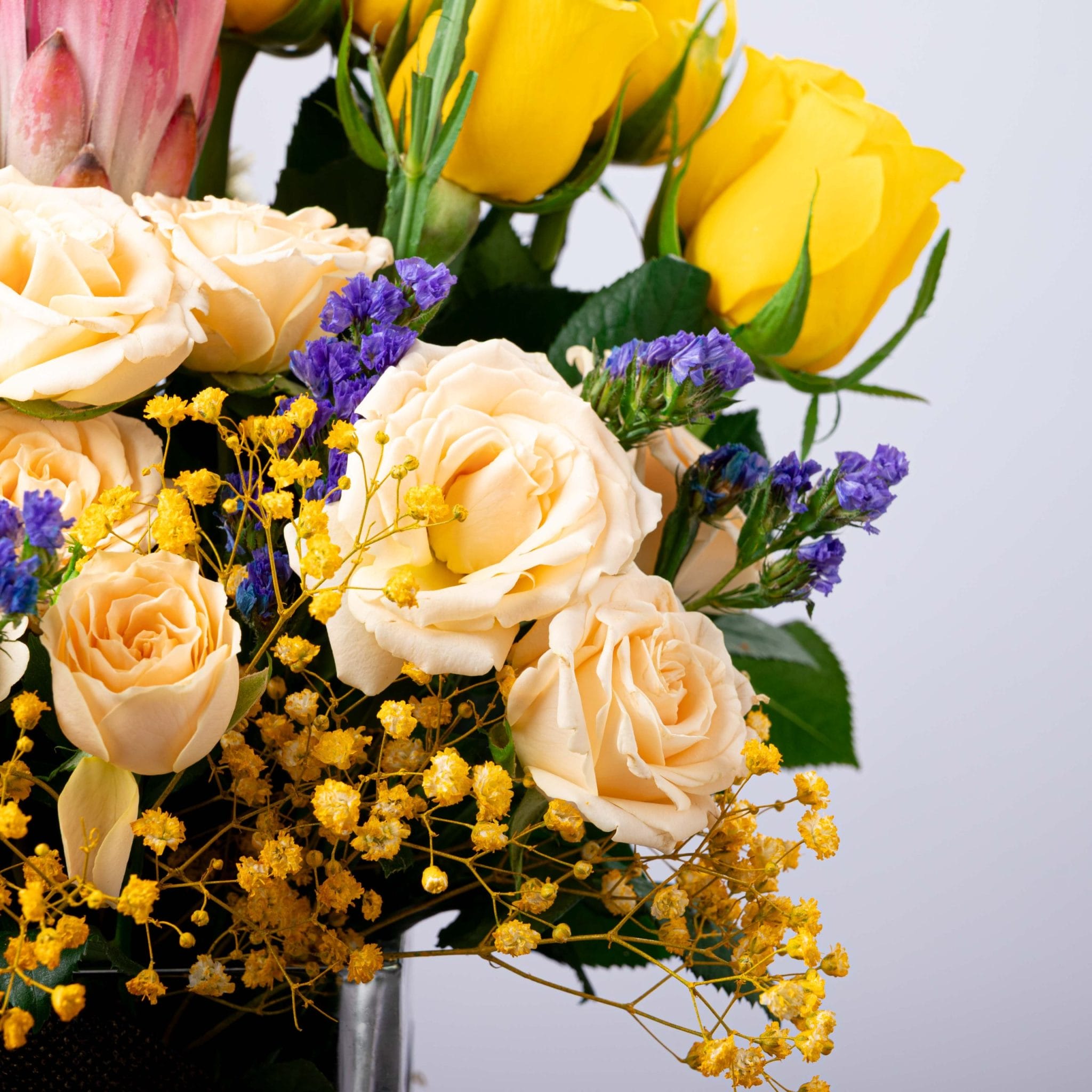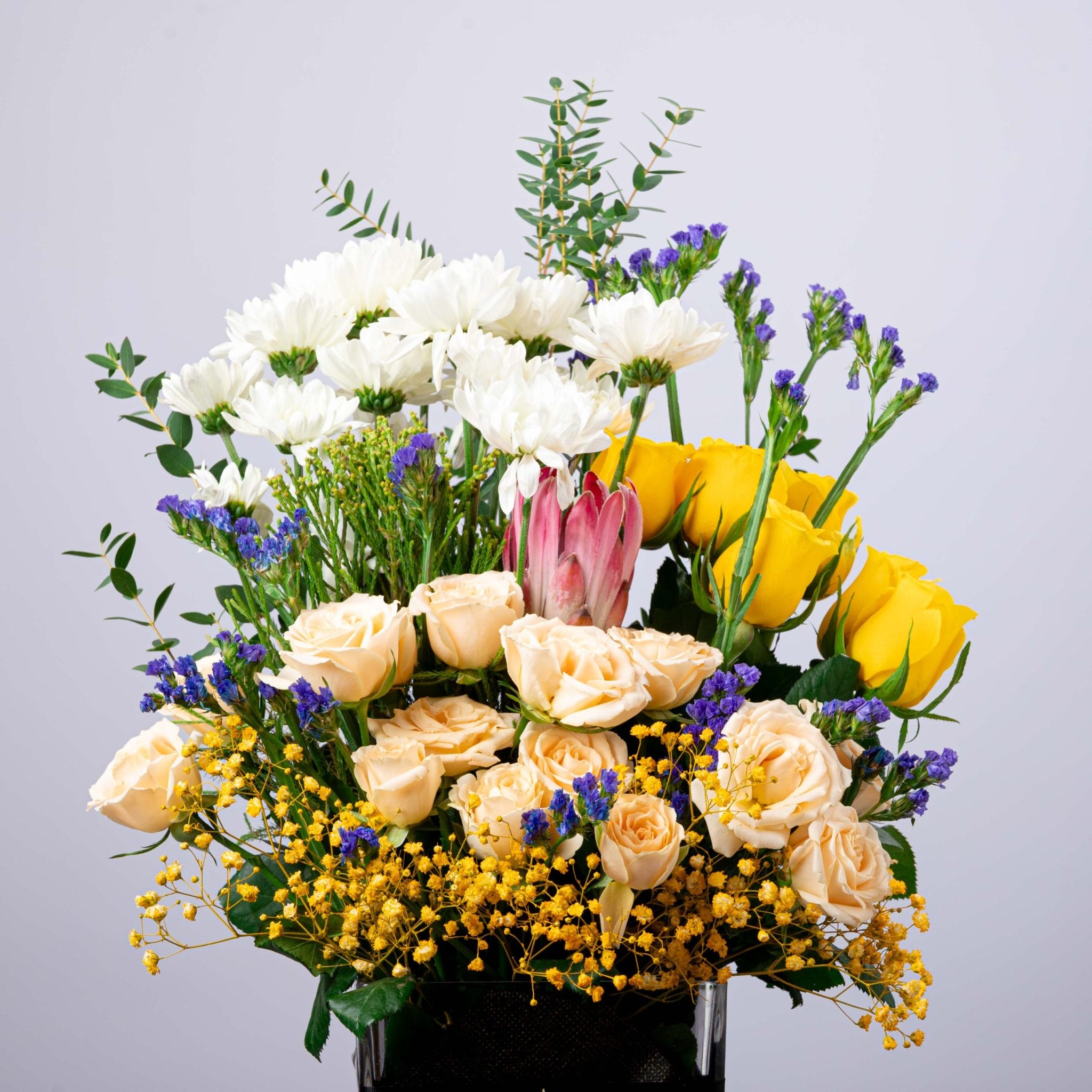تنسيق مشرق من بلومن يجمع بين الورود الصفراء المضيئة والزهور العاجية الناعمة في مزيج يفيض بالبهجة والرقيّ.
