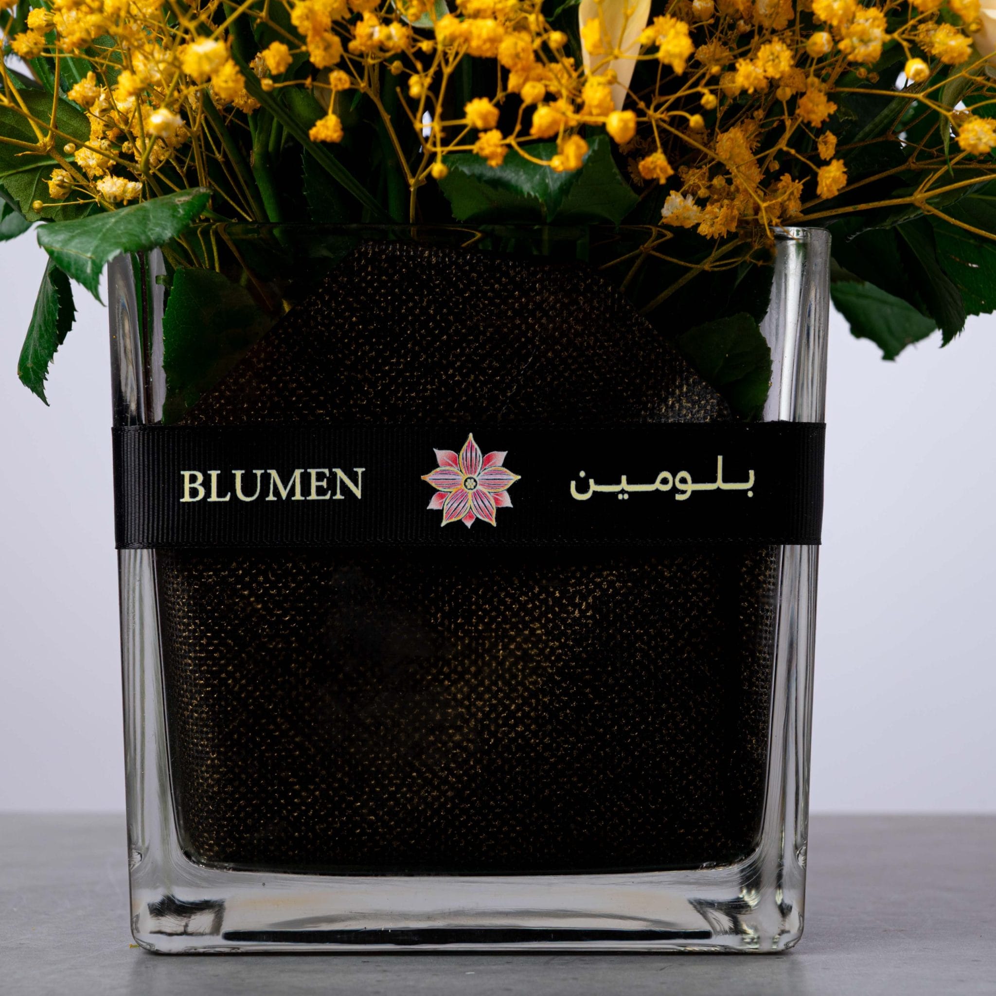 موضوع في مزهرية زجاجية مربعة أنيقة مزيّنة بشريط بلومن الأسود المميز الذي يمنح التصميم توقيعاً فاخراً.