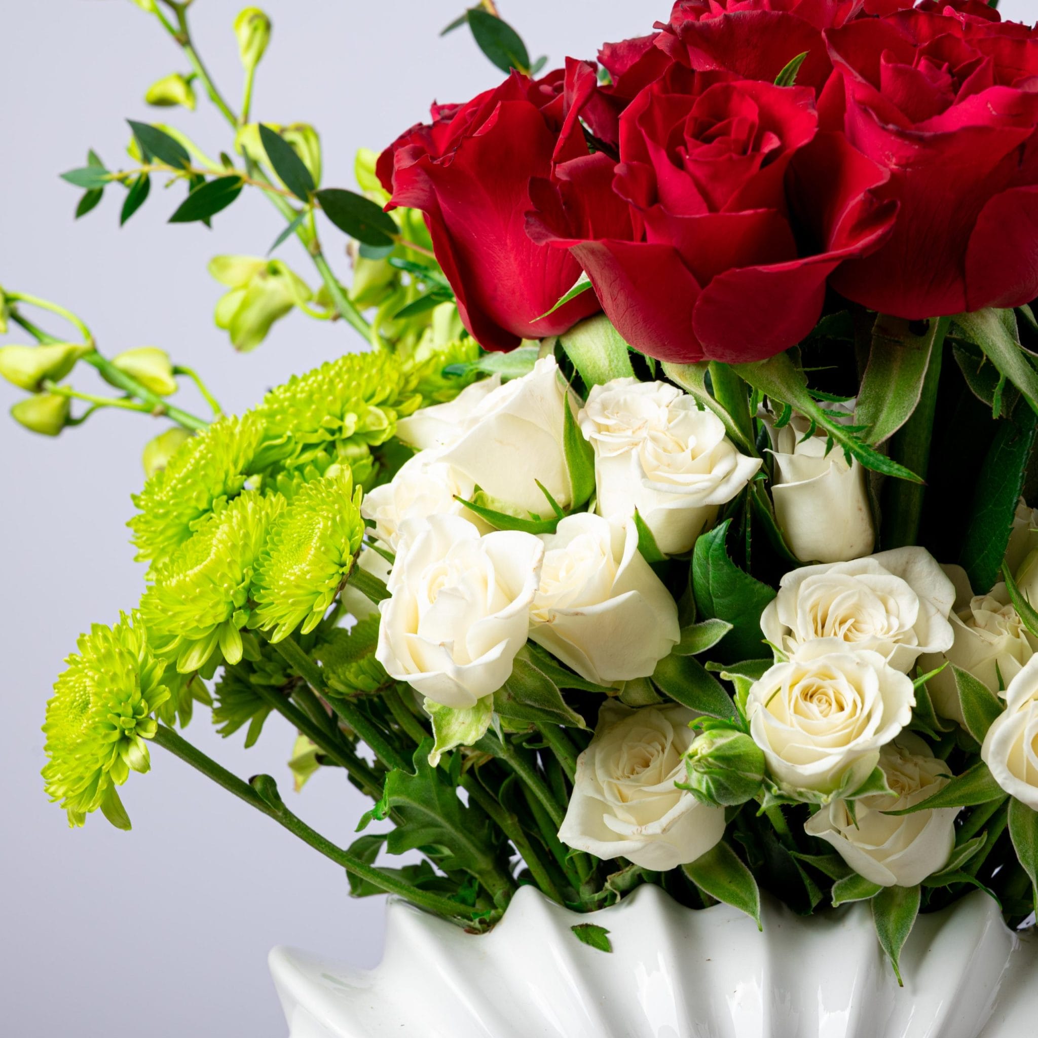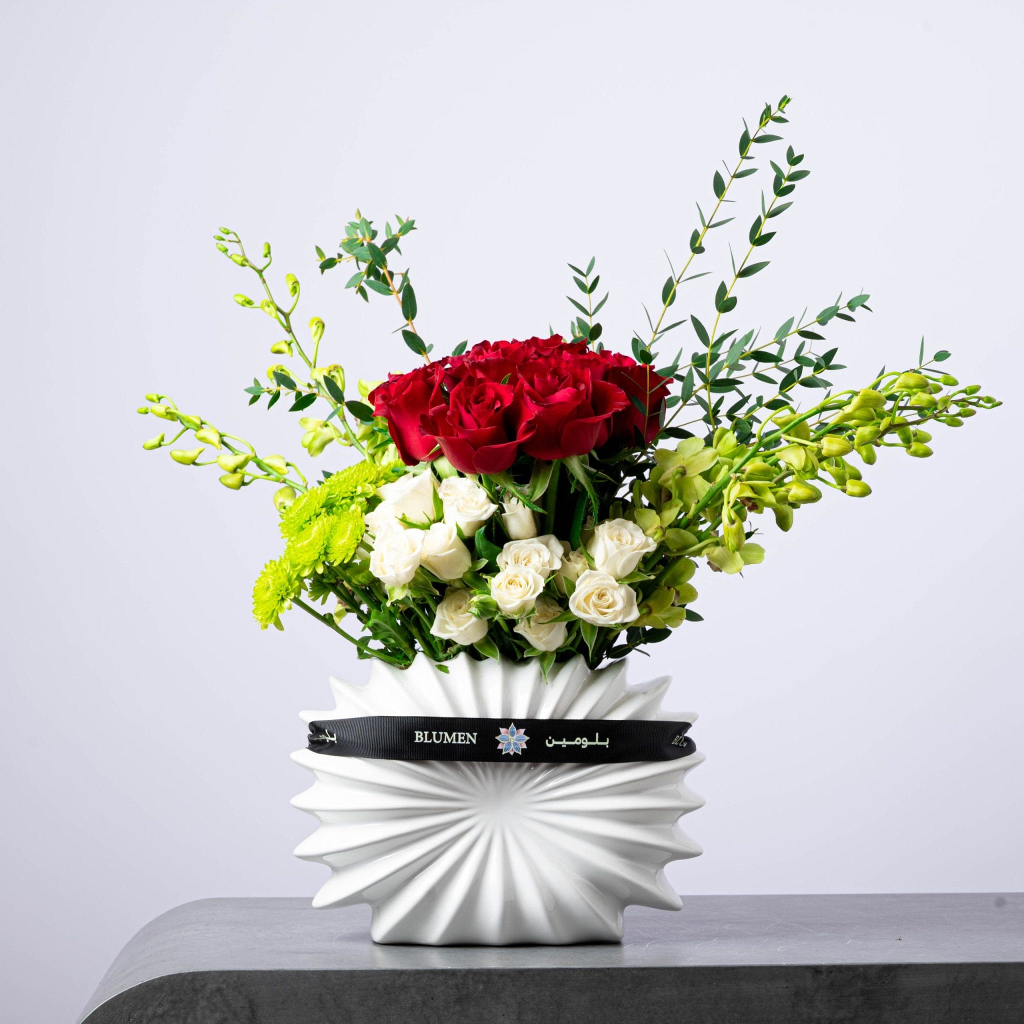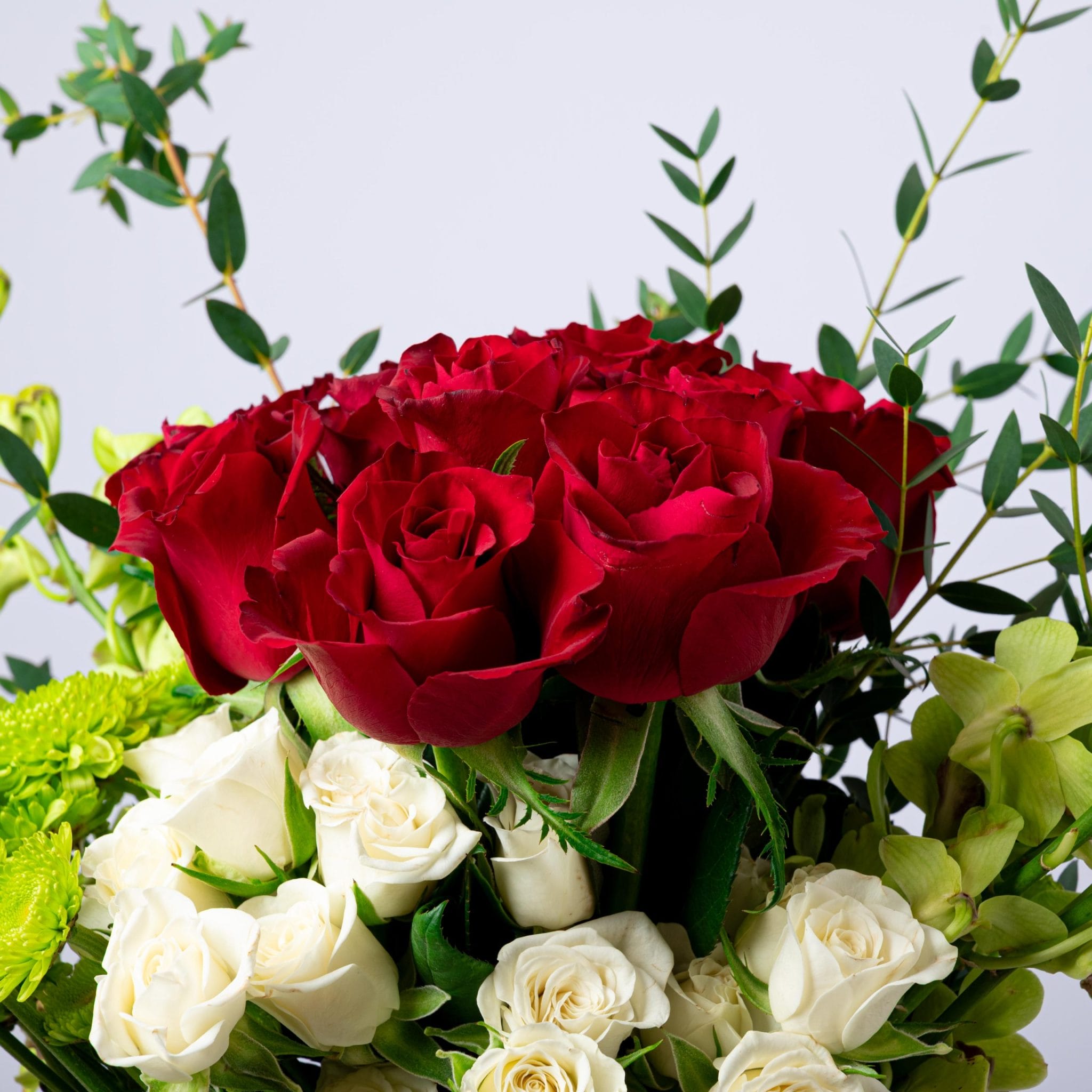 يجمع بين الورود الحمراء الغنية والزهور البيضاء الناعمة مع لمسات من الأوركيد الأخضر الزاهي والأوراق المنسقة بعناية.