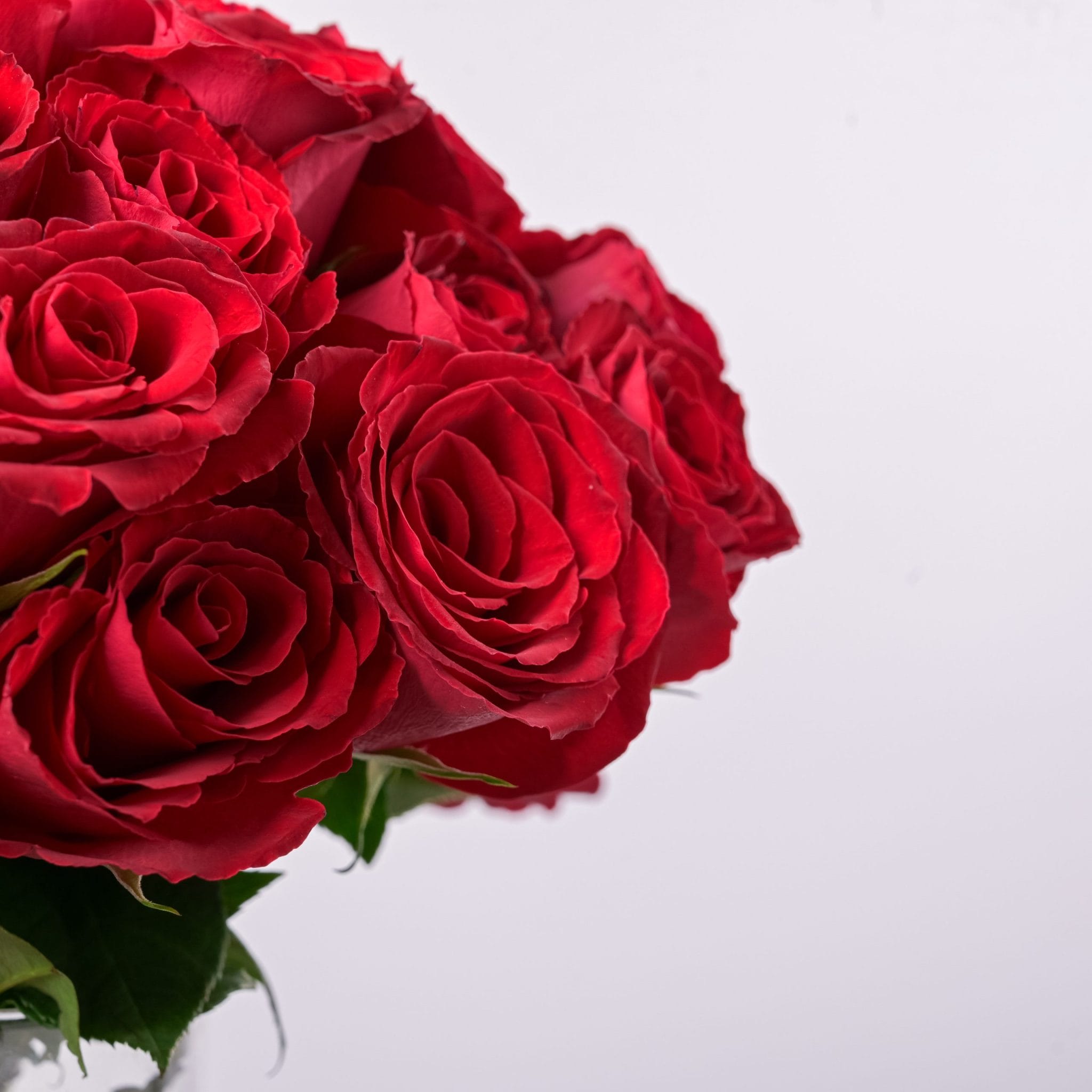 تضم باقة غنية من الورود الحمراء الكاملة مرتبة بعناية داخل مزهرية زجاجية طويلة شفافة تُبرز جمال السيقان وتمنح التصميم حضوراً راقياً ومترفاً.
